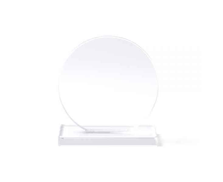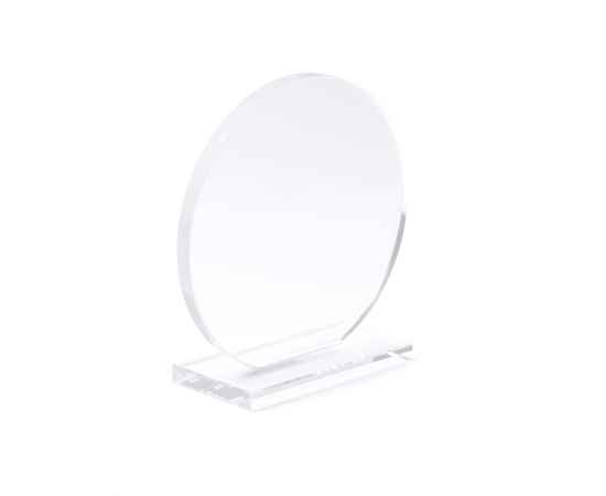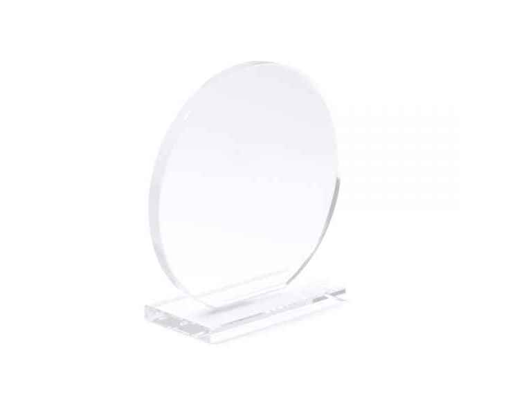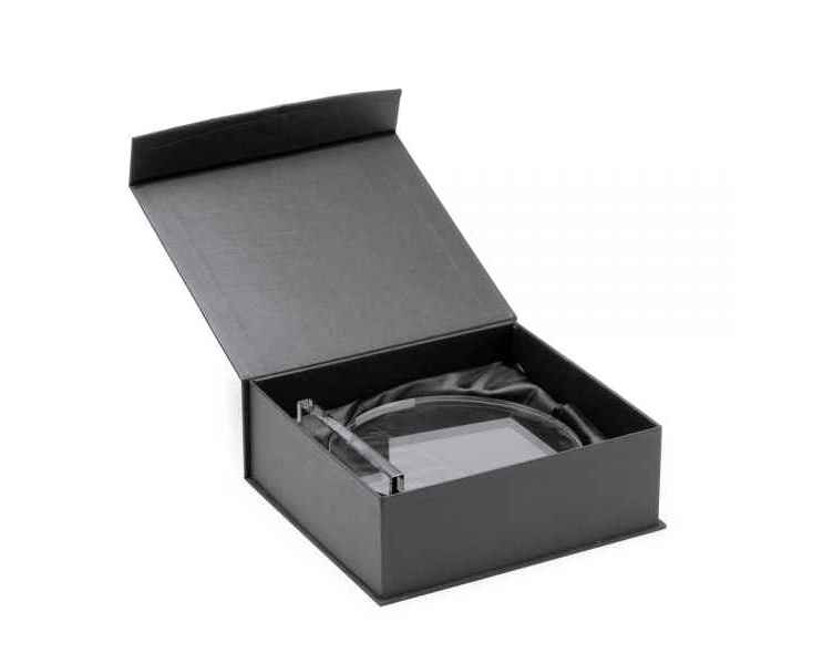 Стеклянная награда круглой формы с прямоугольным основанием. Включает черный презентационный футляр.