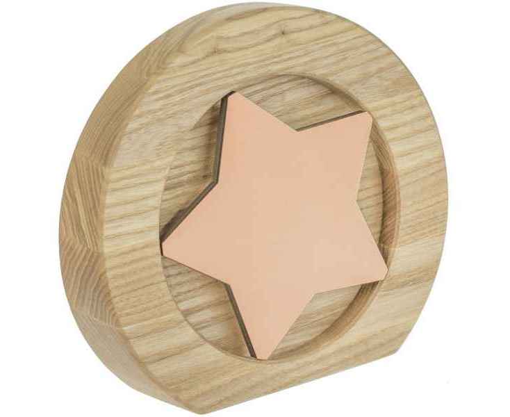 Вставка со звездой из зеркального пластика на деревянной основе крепится на приподнятое основание внутри стелы, что создает объем и многослойность награды. На вставке предусмотрен клеевой слой для крепления после нанесения.