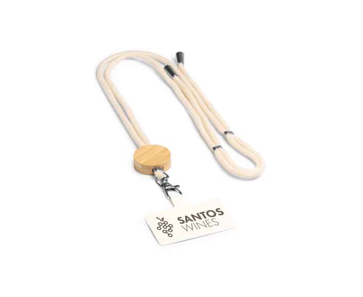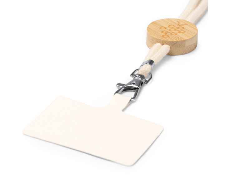 Хлопковый держатель для мобильного телефона со шнуром, с бамбуковой деталью и системой регулировки.