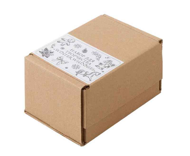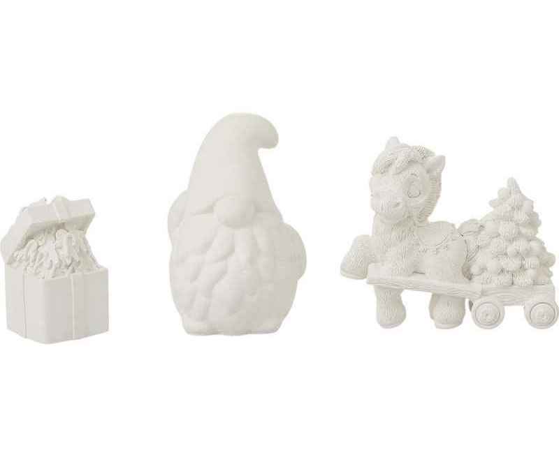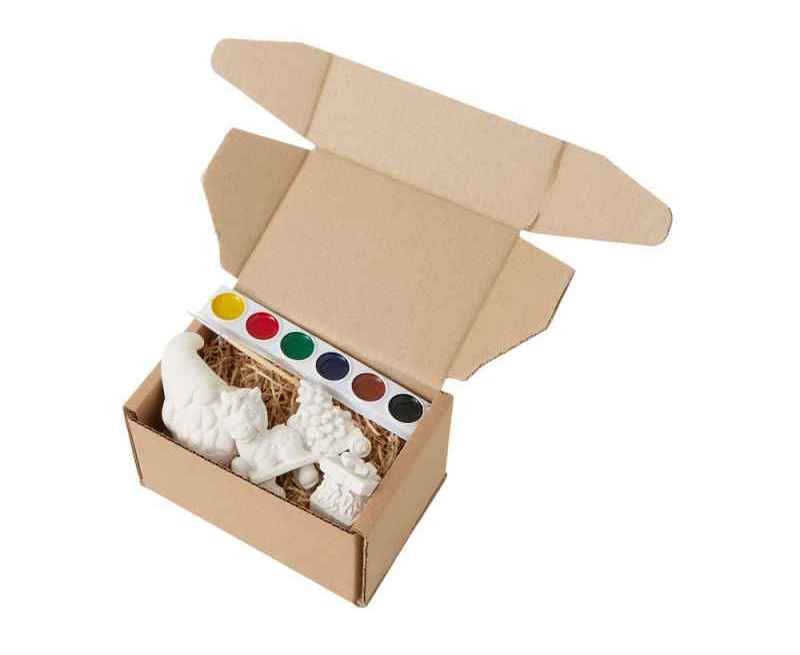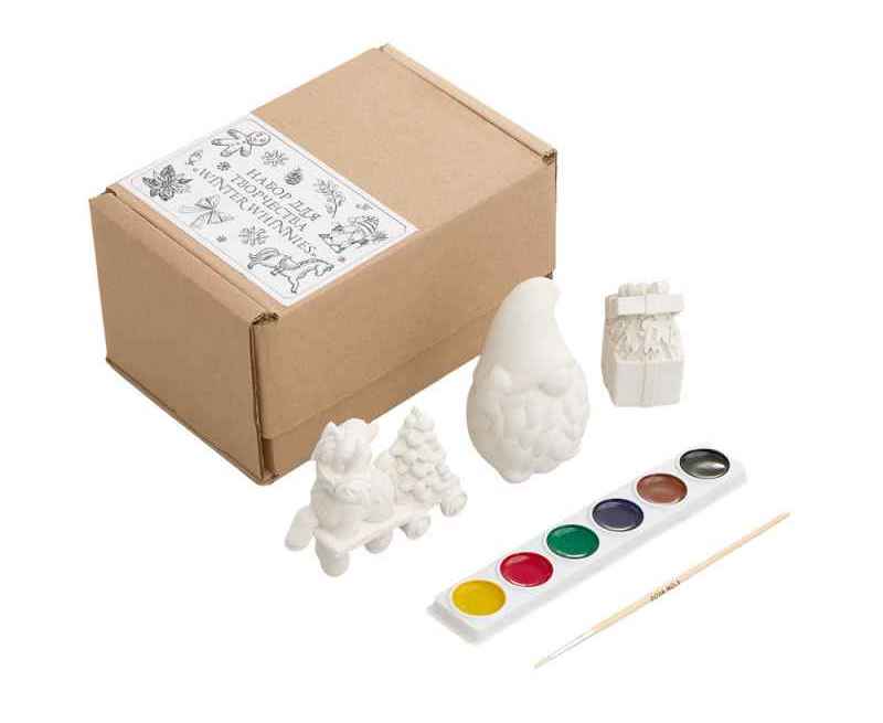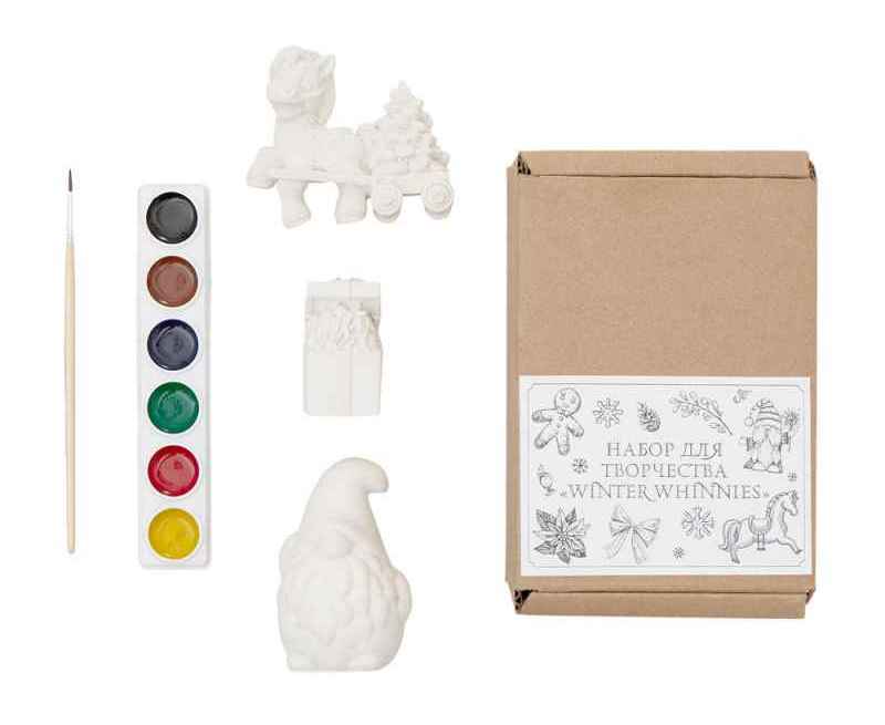 В набор входят три гипсовых фигурки — лошадка елочкой, гном подарочная коробка с пряничными человечками, а также акварельные краски и кисть.