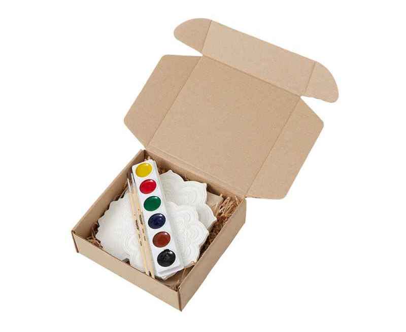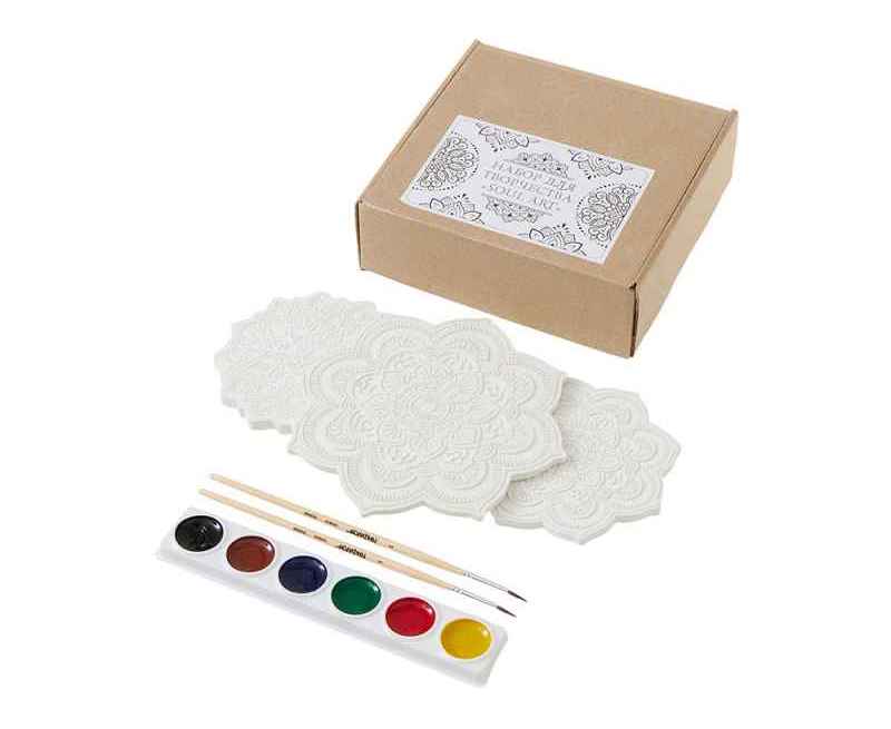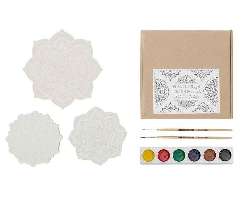 В набор входят три гипсовых фигурки мандал, а также акварельные краски и 2 кисти - более тонкая для прокраски самых тонкие деталей и чуть более толстая.