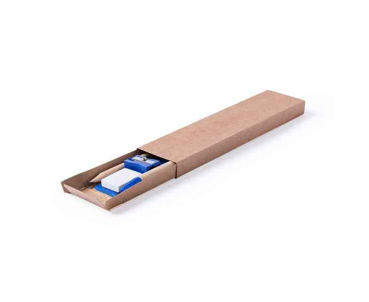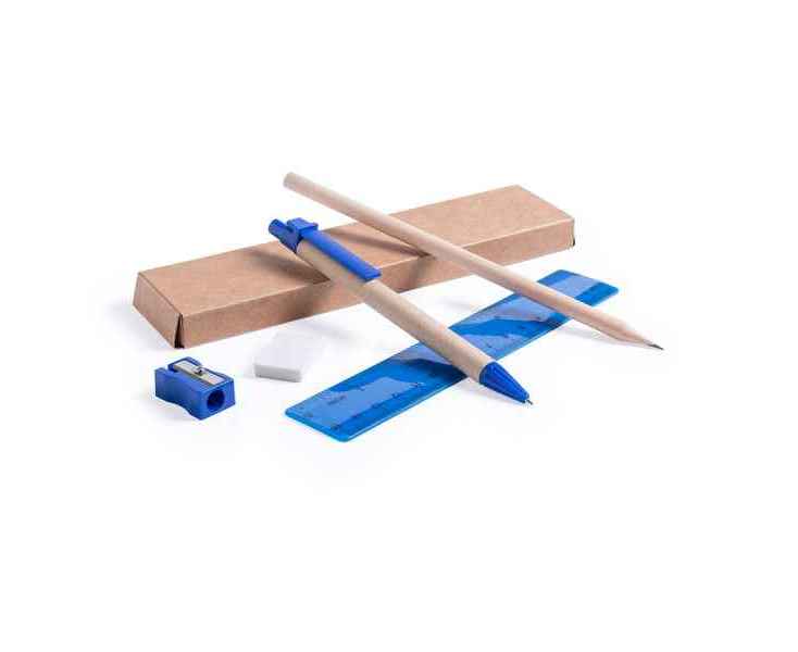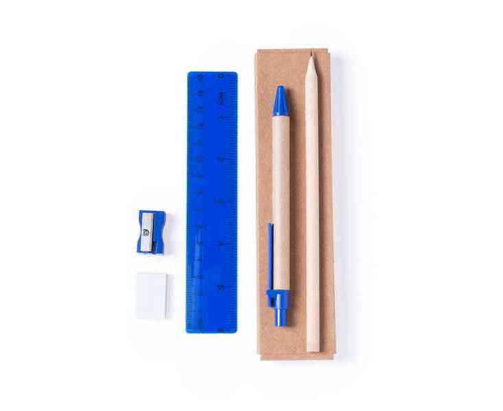 Набор из 5 предметов, представленных в натуральном картонном футляре. Включает в себя:,, • деревянный карандаш с круглым сечением корпуса, • пластиковую точилку для карандашей, • ластик, • пластиковую линейку 15 см, • ручку с кнопочным механизмом подачи стержня. Корпус ручки из рециклированного картона, детали из цветного пластика. Цвет чернил синий.,,