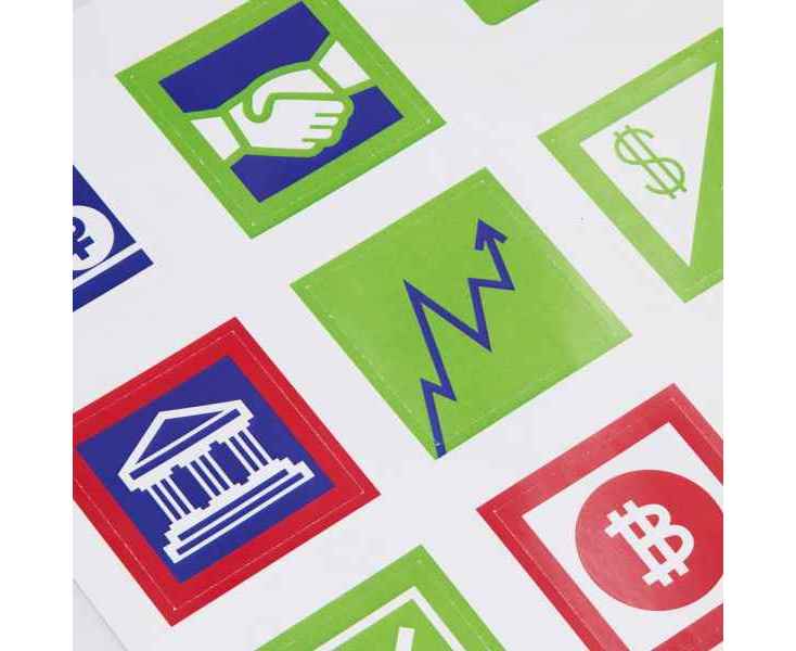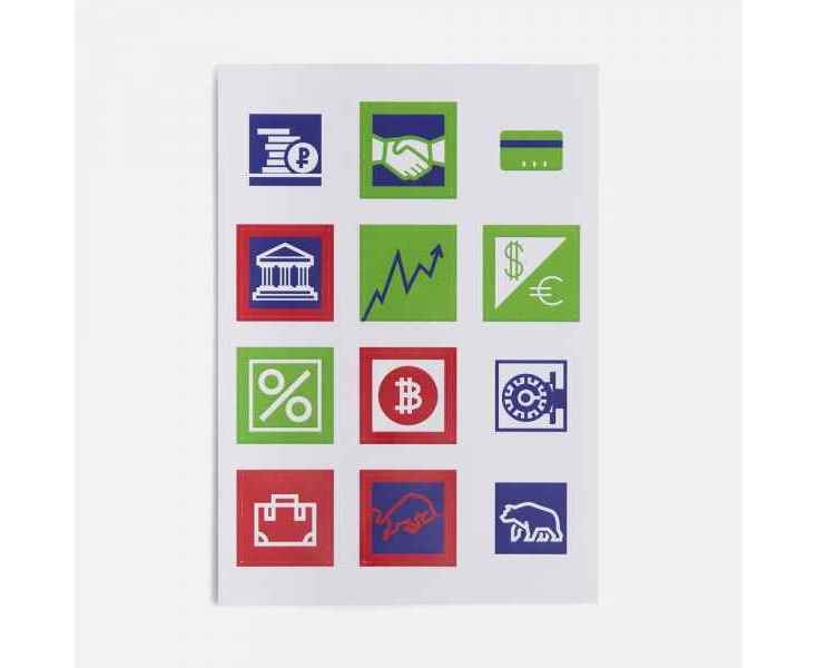 В каждой части общего рисунка изображены главные символы, связанные с финансами.