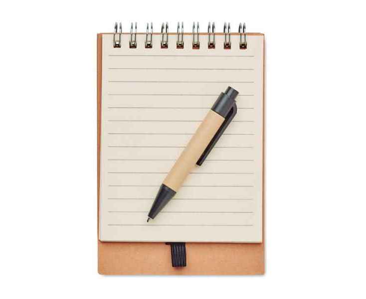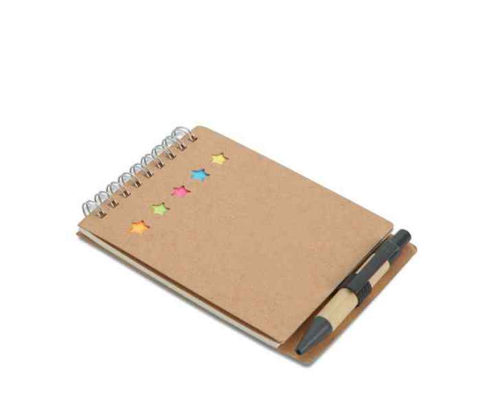 Блокнот на 40 листов переработанной бумаги, 5 цветных закладок и блок из 20 стикеров. Шариковая ручка из картона. Черные чернила.