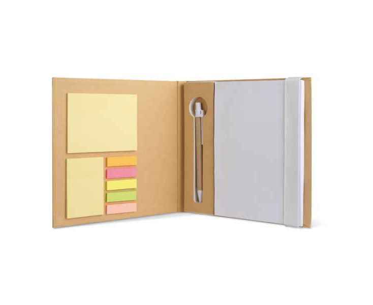 Блокнот с ручкой из переработанной бумаги с двумя блоками стикеров и разноцветными закладками.
