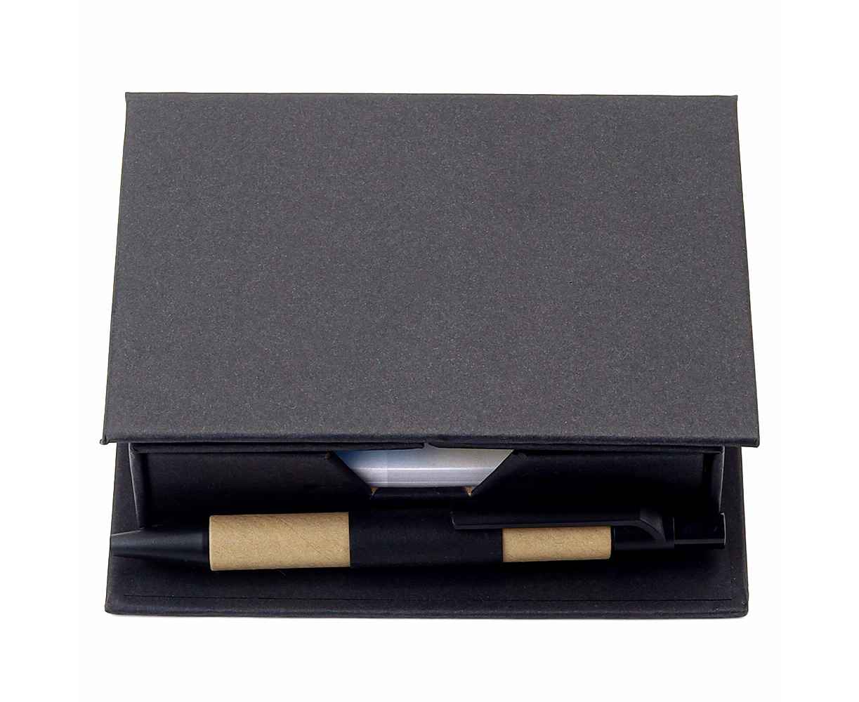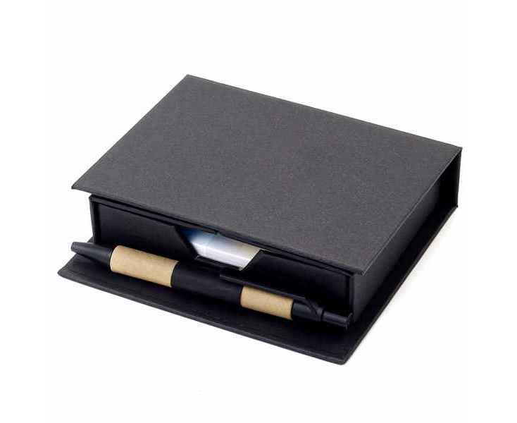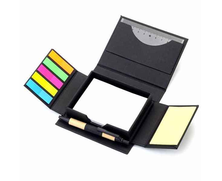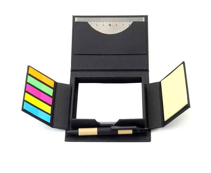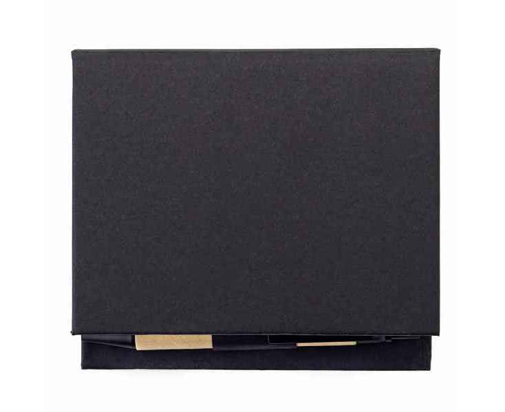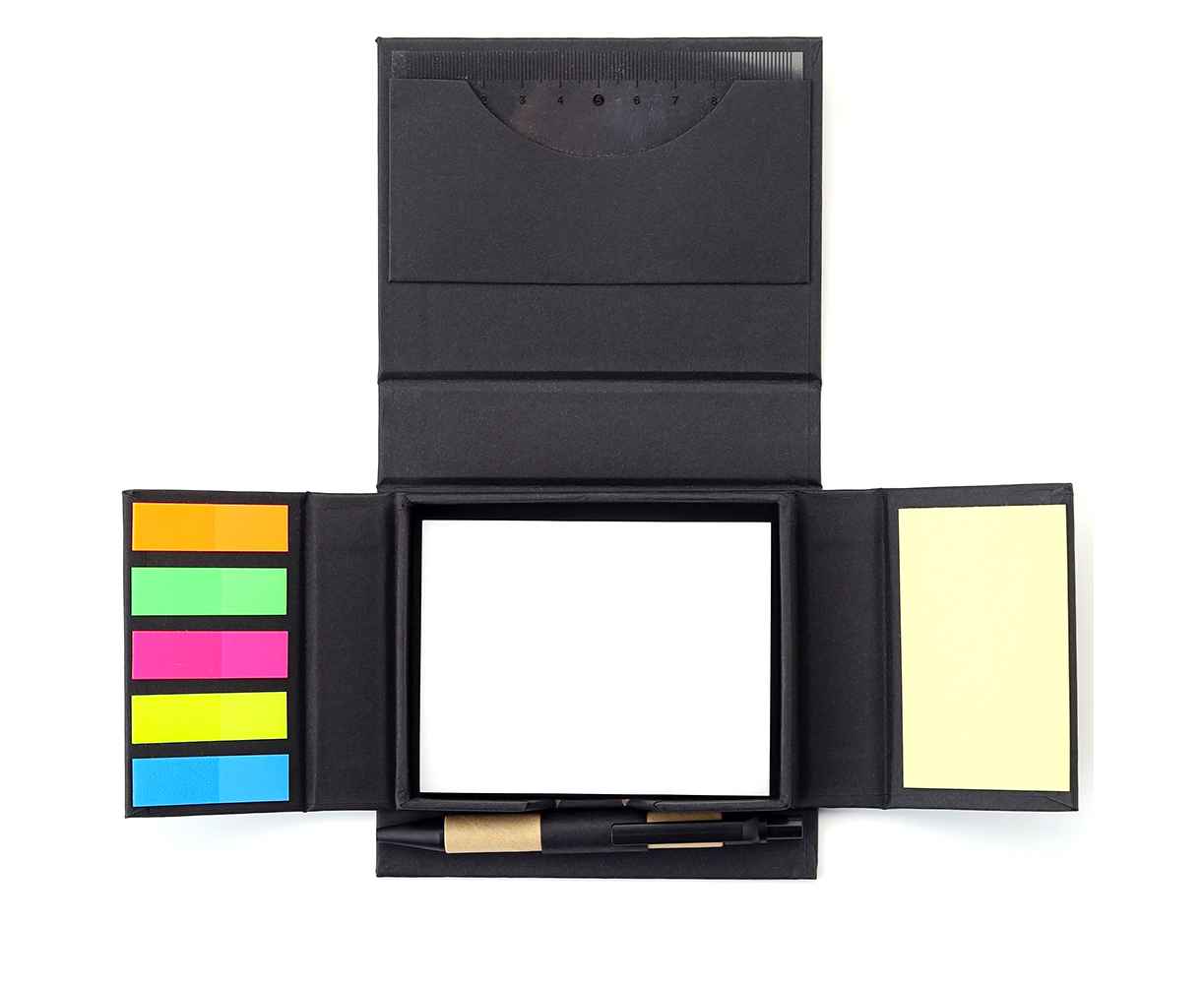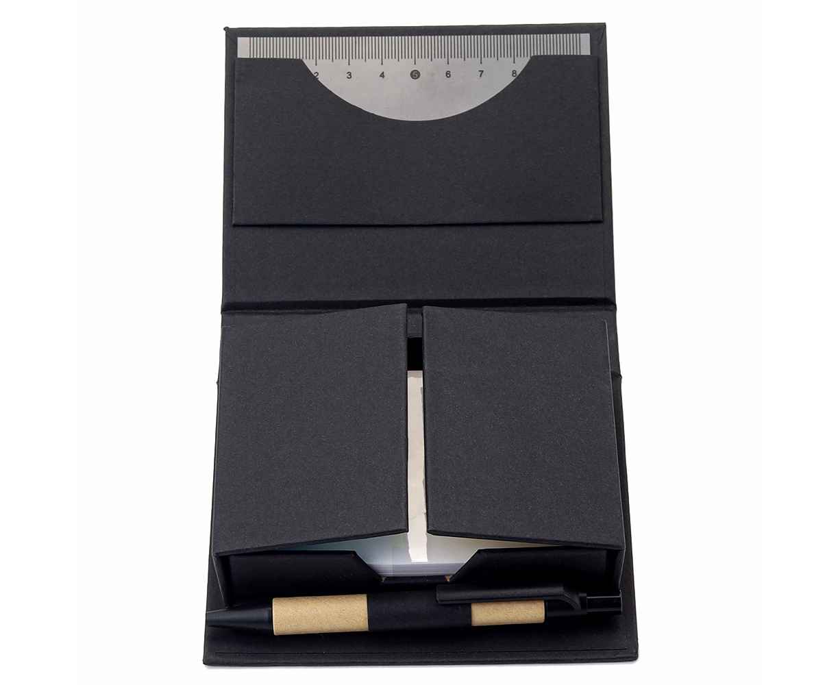 В компактном футляре из переработанного черного картона вы найдете разноцветные стикеры, бумагу для заметок, линейку и ручку — всё необходимое для удобного планирования и творчества в одном наборе.