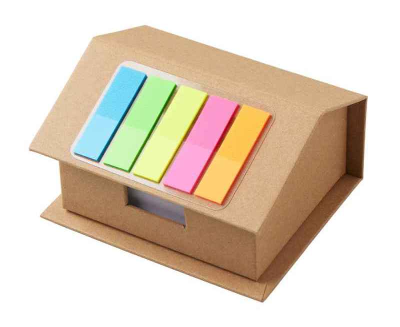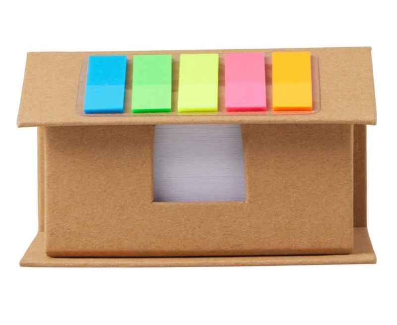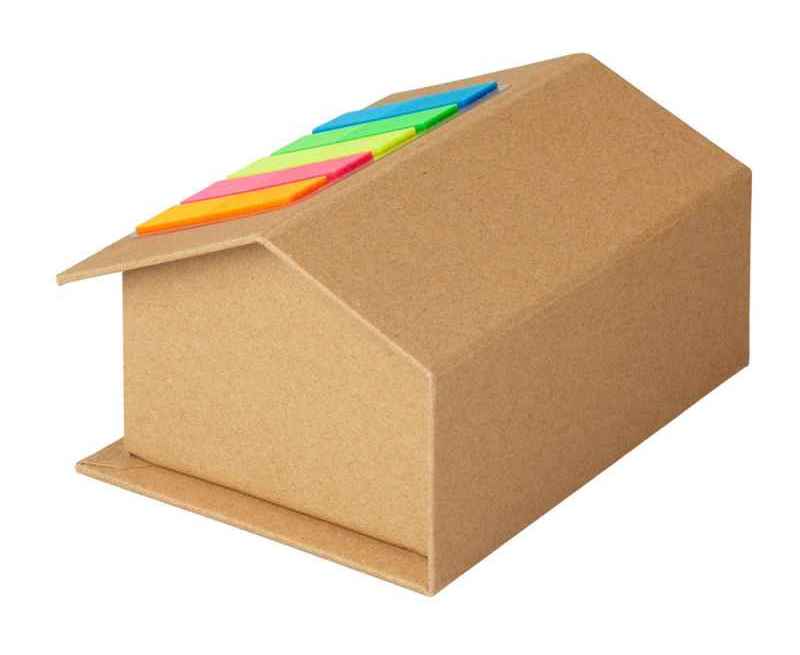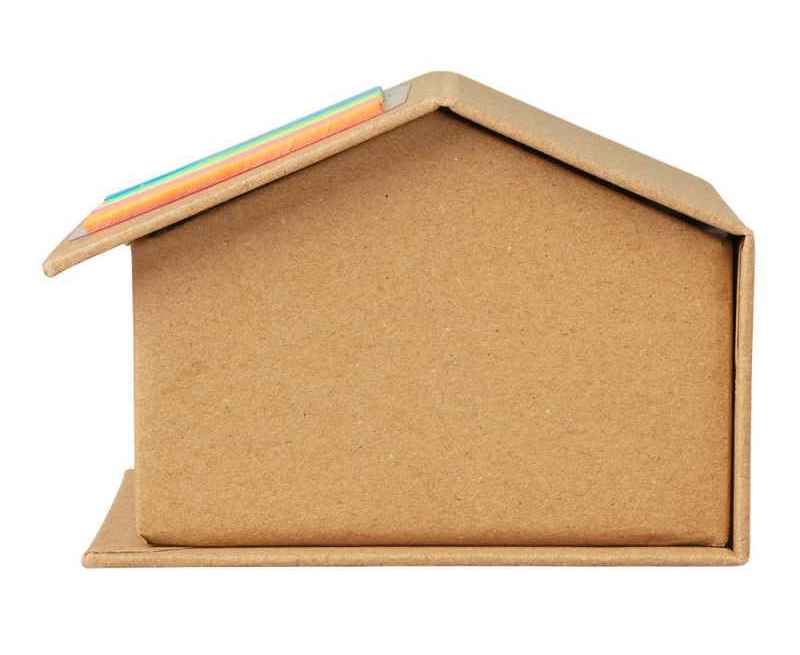 Набор стикеров и бумаг для записи в виде домика. На крыше домика расположены стикеры, 5 цветов по 25 штук каждого цвета. Внутри домика - 400 листов белой бумаги для записей плотностью 70 г/м2.