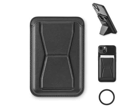 Чехол для карт из искусственной кожи (для 2 карт) с функцией подставки и магнитной застежкой. Подходит для iPhone® 12 и новее. Включает магнитное металлическое кольцо для зарядки других немагнитных беспроводных устройств.