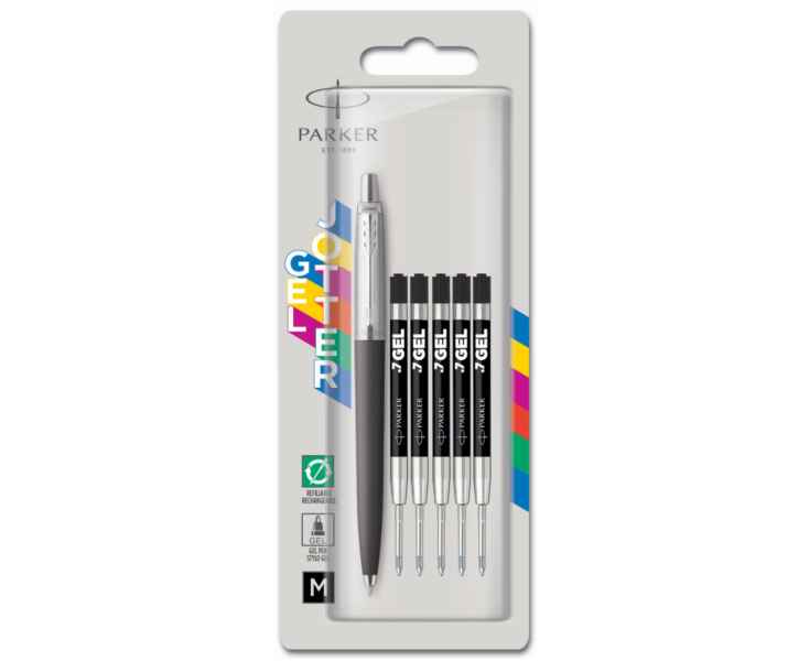 Подробнее о Parker Набор в блистере: Ручка гелевая 'Parker Jotter Black' + 5 гелевых стержней. толщина линии М в блистере.