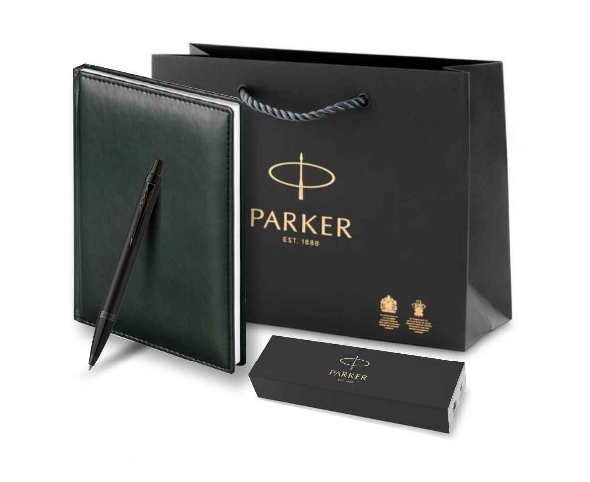 Шариковая ручка Parker IM MBLK BT выполнена из латуни, покрыта лаком. Нажимной механизм. Толщина пишущего узла М (medium) - Средний 1 мм. Цвет чернил синий. Страна производства Франция. С марта 2020 на наших производствах изготовляются новые подарочные коробки без листовок с гарантийным талоном. Мы заботимся об окружающей среде, и распечатывать гарантию необязательно. Основным документом при обращении в сервисный центр будет чек., Ежедневник недатированный черный с белым срезом страниц из искусственной кожи (15х21 см). Блок 920: недатированный ;кол-во страниц — 336; бумага — белая, плотность 70 г/м²; форзац и нахзац — карты России и Европы.