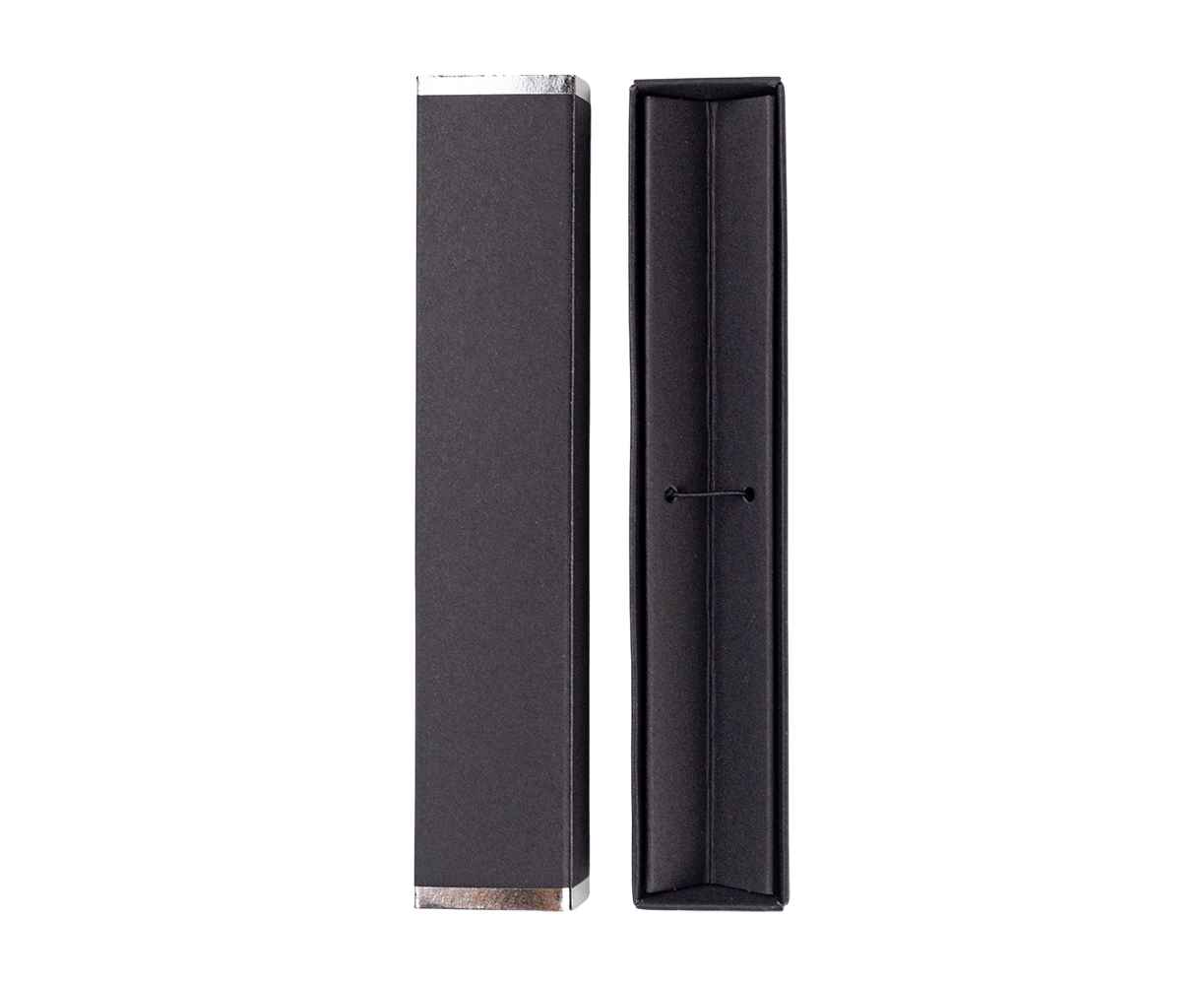 Бумажная коробочка для ручки. Ложемент V-образный с резинкой, фиксирующей ручку. По краям крышки металлизированные декоративные элементы, для красоты. В такой коробочке подаренная ручка будет выглядеть ещё дороже, словно фотомодель в вечернем платье.