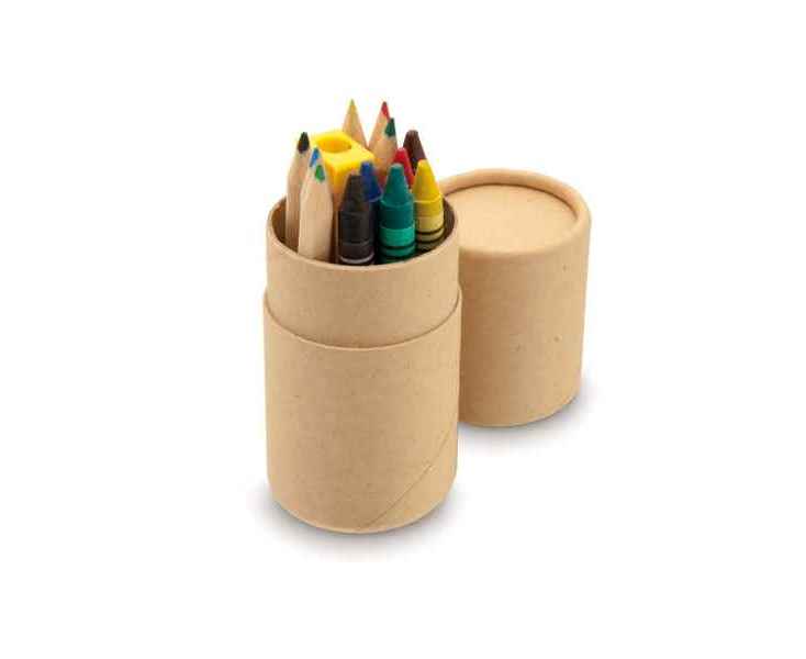 Набор из 13 предметов в цилиндрическом картонном футляре. Включает в себя: • деревянные мини карандаши с шестигранным сечением корпуса, 6 цветов, • восковые мелки с круглым сечением корпуса, 6 цветов, • пластиковая точилка.