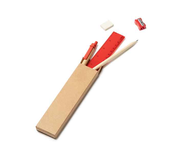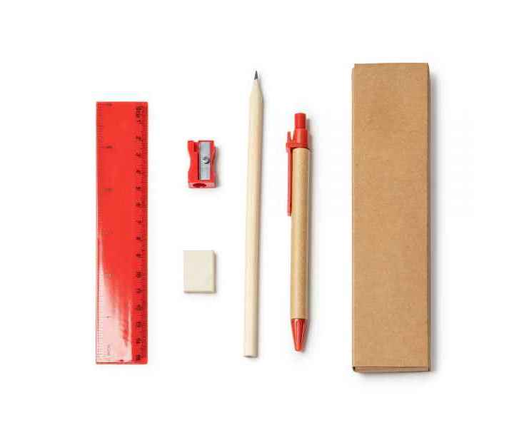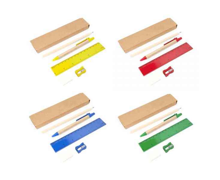 Набор из 5 предметов, включающий шариковую ручку с картонным корпусом и синими чернилами, деревянный карандаш, точилку, резинку и линейку 15 см.