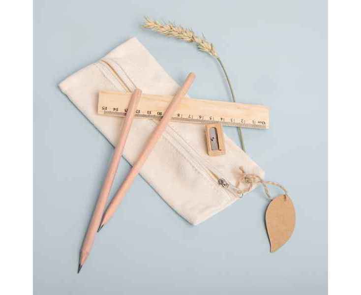 Удобный и функциональный пенал, в который входят 2 чернографитных карандаша HB с грифелем 2,0 мм, деревянная линейка 15 см и точилка из дерева со стальным лезвием. Эко пенал украшает листочек из крафтового картона, коттрый так же подходит для персонализации.