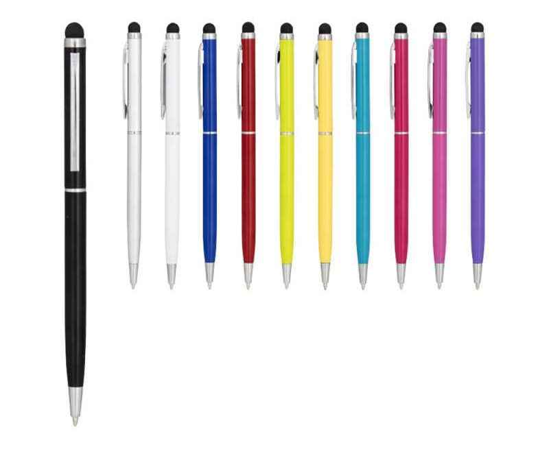 Алюминиевая шариковая ручка Joyce. Тонкая алюминиевая шариковая ручка с поворотным механизмом и стилусом. Алюминиевый корпус с металлическим зажимом и кольцом посередине, остальные элементы из пластика.