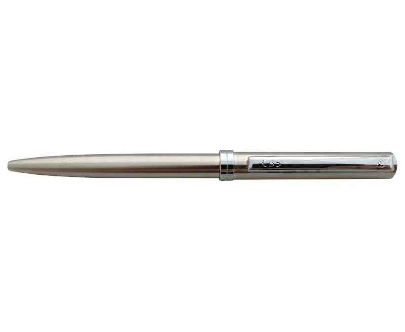 Письменные принадлежности в металлическом корпусе и блестящие хромированные металлические детали. Механика нажимного колпачка, качественный металлический суперобъёмный стержень с синей пастой.