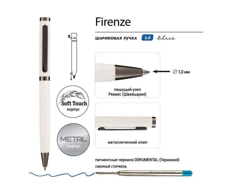 Ручка автоматическая, с легким поворотным механизмом подачи стержня. Надежный пишущий узел d 1,0 мм (от швейцарского производителя Premec) гарантирует высокое качество также, как и пигментные чернила Dokumental (Германия). Благодаря им писать ручкой Firenze одно удовольствие – она мягко скользит по поверхности бумаги, оставляя ровную, четкую линию.