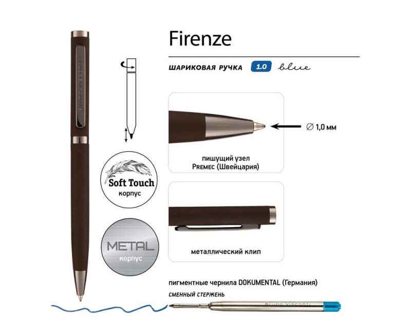 Ручка автоматическая, с легким поворотным механизмом подачи стержня. Надежный пишущий узел d 1,0 мм (от швейцарского производителя Premec) гарантирует высокое качество также, как и пигментные чернила Dokumental (Германия). Благодаря им писать ручкой Firenze одно удовольствие – она мягко скользит по поверхности бумаги, оставляя ровную, четкую линию.