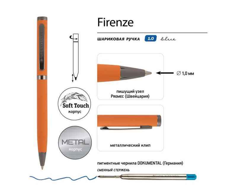 Ручка автоматическая, с легким поворотным механизмом подачи стержня. Надежный пишущий узел d 1,0 мм (от швейцарского производителя Premec) гарантирует высокое качество также, как и пигментные чернила Dokumental (Германия). Благодаря им писать ручкой Firenze одно удовольствие – она мягко скользит по поверхности бумаги, оставляя ровную, четкую линию.