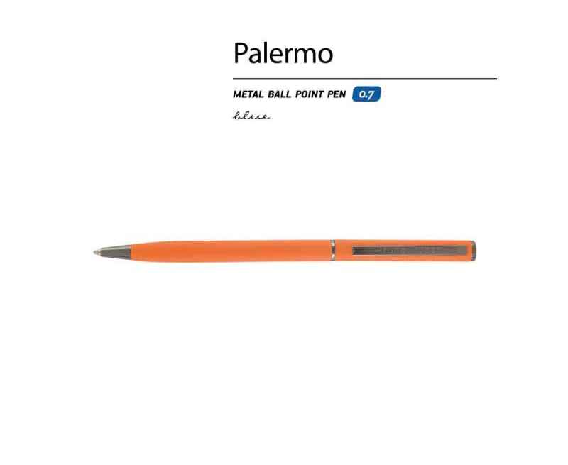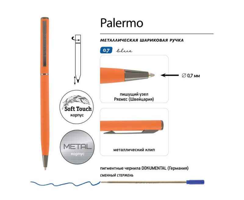 Автоматическая металлическая ручка Bruno Visconti серии Palermo однотонного цвета порадует любителей всего изящного и утонченного. Покрытие корпуса Soft Touch гарантирует дополнительный комфорт в работе с ней. Стержень легко выдвигается благодаря поворотному механизму. Синие пигментные чернила Dokumental (Германия) и пишущий узел Premec (Швейцария) обеспечивают качественное и мягкое письмо.