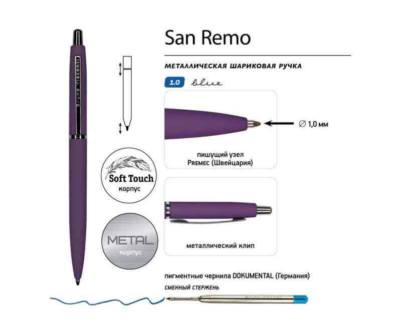 Металлическая шариковая ручка San Remo - аксессуар, призванный стать настоящим элементом стиля, подчеркнуть индивидуальность его владельца.