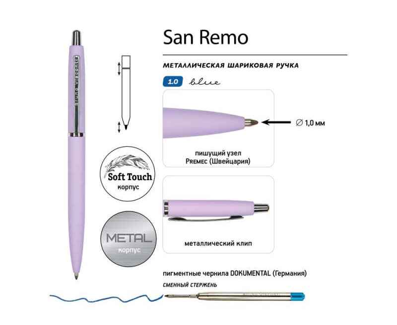 Металлическая шариковая ручка San Remo - аксессуар, призванный стать настоящим элементом стиля, подчеркнуть индивидуальность его владельца.
