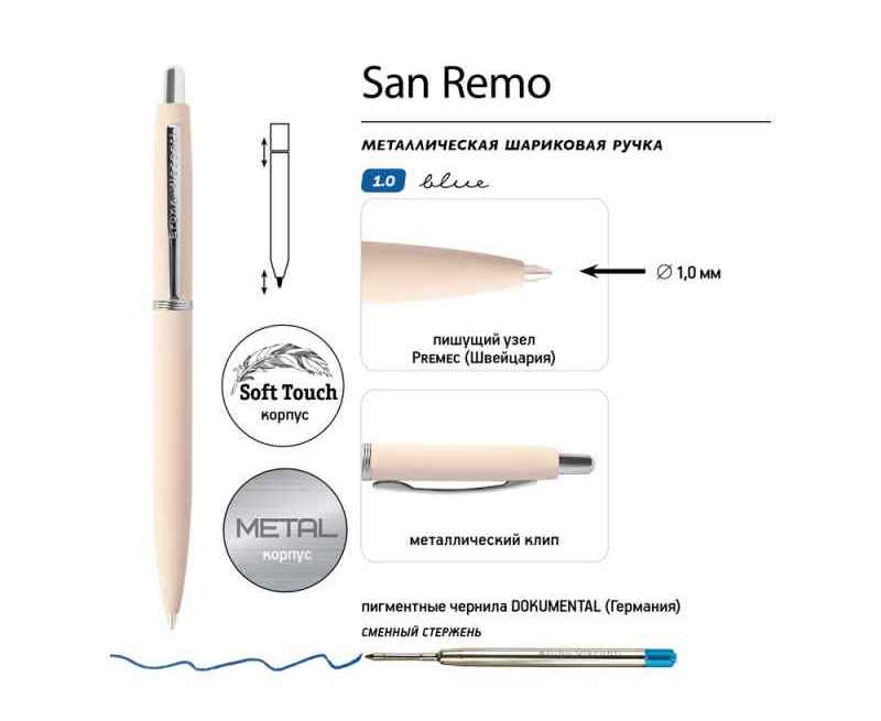 Металлическая шариковая ручка San Remo - аксессуар, призванный стать настоящим элементом стиля, подчеркнуть индивидуальность его владельца.