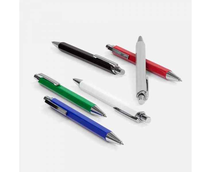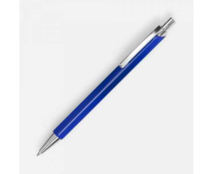 Металлическая шариковая ручка в глянцевом шестигранном корпусе с хромированными деталями.