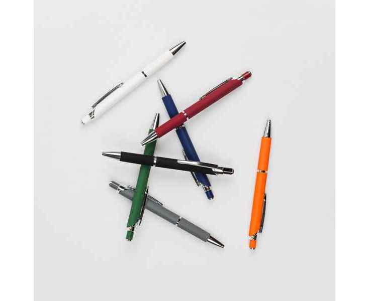 Металлическая ручка с покрытием софт-тач и серебристыми деталями.