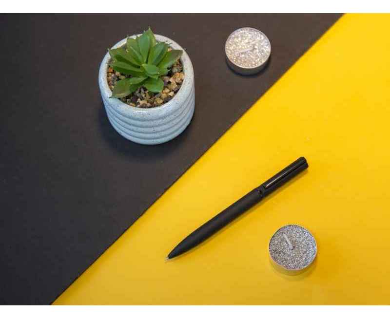 Эта металлическая ручка имеет очень необычную интересную форму — верхняя часть (до поворотного механизма) уже, чем нижняя. За счёт покрытия софт-тач ручка очень приятна на ощупь. При гравировке вскрывается серебристый слой.
