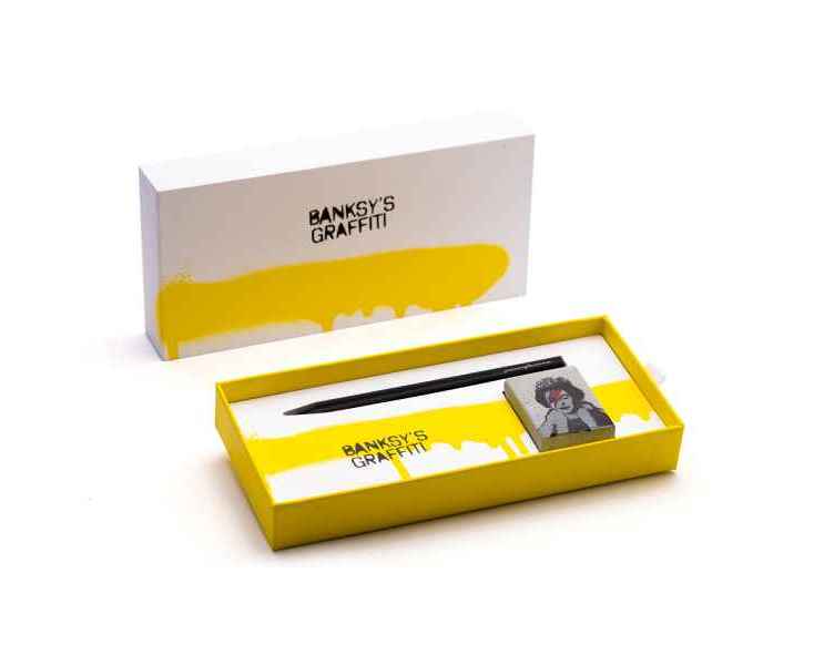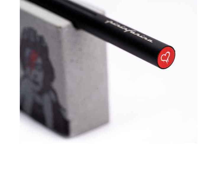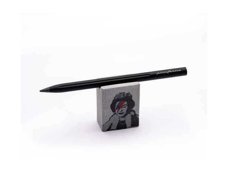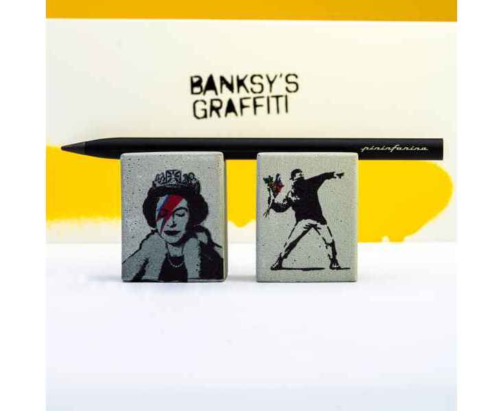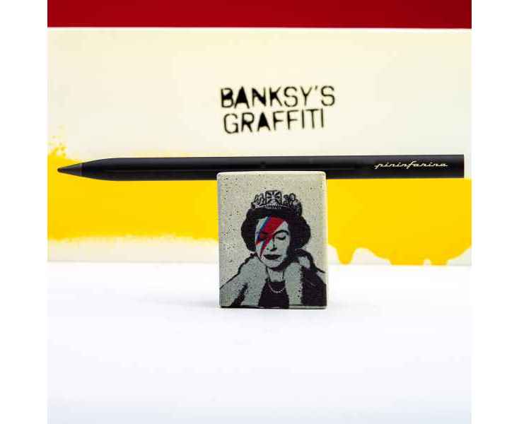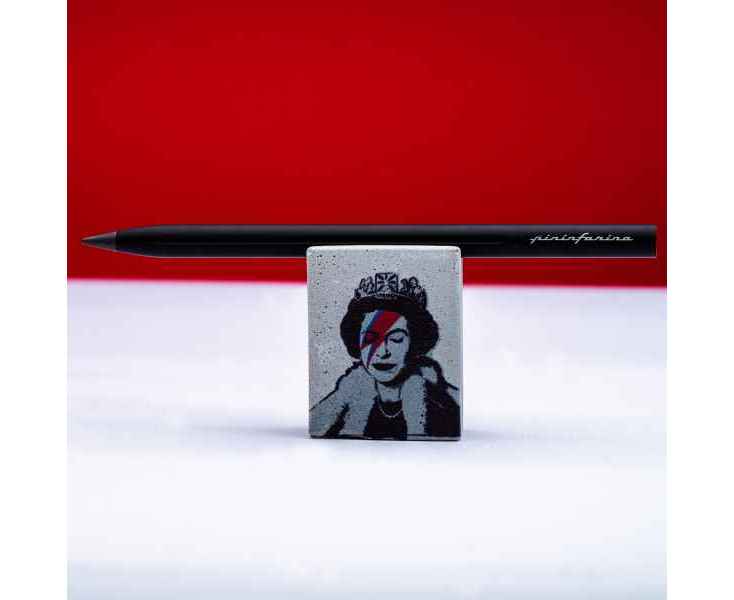 Набор из лимитированной коллекции с культовыми граффити Banksy Lizzy Stardust, посвященным Елизавете II. Инновационный, совершенно необычный карандаш Pininfarina SMART с цельным алюминиевым матовым корпусом черного цвета и сменным пишущим наконечником из материала GrafeeX. На торце карандаша граффити Banksy сердце на красном фоне. GrafeeX - это запатентованный инновационный материал, полученный в результате спекания мелких частиц графита при высоких температурах. То есть он пишет, как обычный графитовый карандаш, но из-за высокой плотности материала крайне экономно расходуется, и его хватает очень надолго. Длина карандаша 15,3 см, диаметр 0,9 см, вес 25 гр. В набор входит бетонная подставка с граффити, изготовленная вручную, на которую кладется этот карандаш, становясь оригинальным арт-объектом на вашем столе. Сделано в Италии.