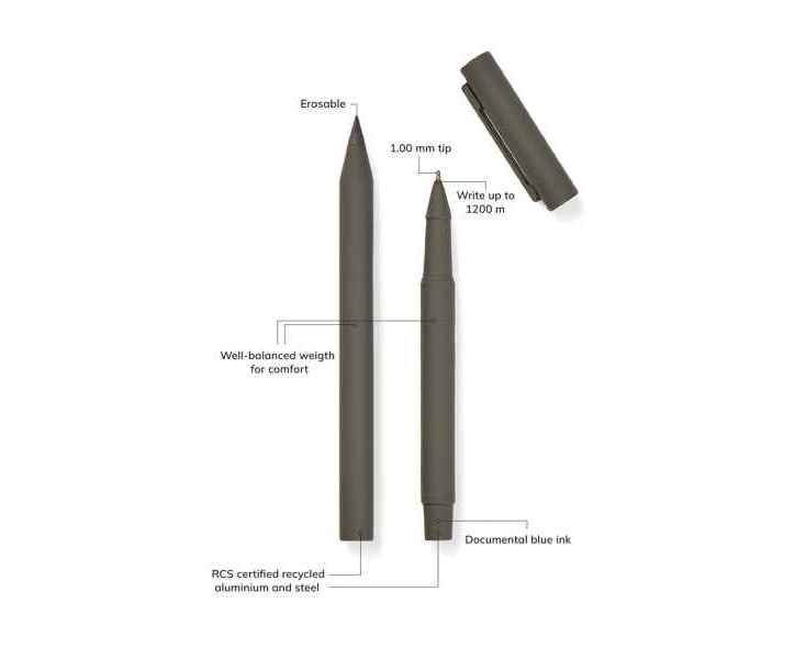 Современный и элегантный набор Baltimore шведского бренда VINGA включает в себя два предмета: шариковую ручку с колпачком и вечный карандаш. Корпус изделий выполнен из переработанной нержавеющей стали, сертифицированной RCS. Толщина письма шариковой ручки — 1 мм, чернила — Documental синего цвета, которых хватит, чтобы прочертить линию до 1200 м. Вечный карандаш похож на классический, но по расходу сопоставим с сотней графитовых. Переработанные материалы изделия сертифицированы RCS (Recycled Claim Standard). Сертификация RCS гарантирует, что вся цепочка поставок проверена и подтверждена. Содержание вторсырья: 52% переработанного алюминия и 10% переработанной нержавеющей стали. Набор поставляется в фирменной коробке.