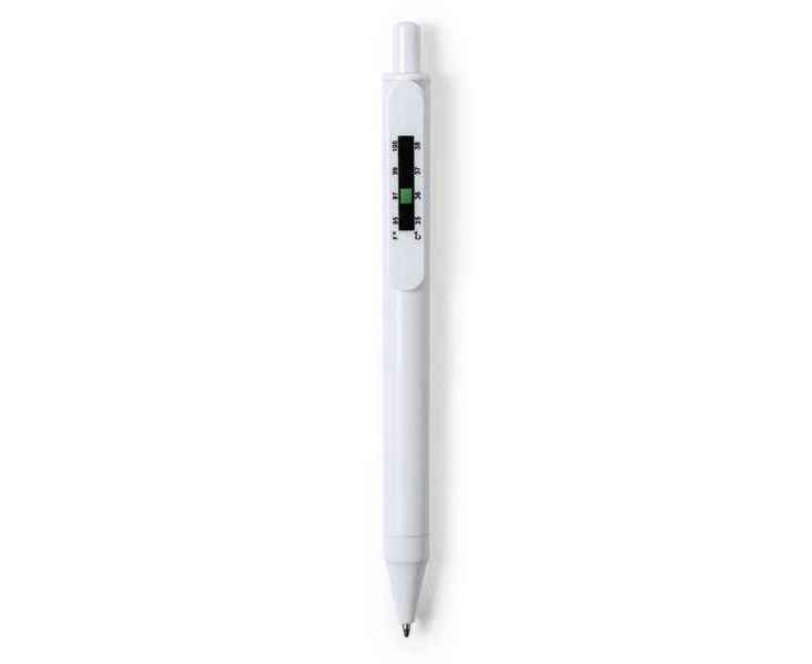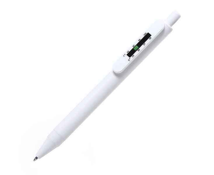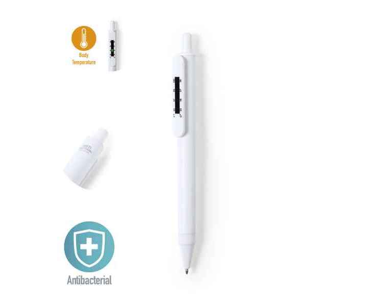 Шариковая ручка с антибактериальным покрытием, с термометром, встроенным в клип. Кнопочный механизм. Монохромный дизайн, специально разработанный для тампонной печати. Синие чернила.Представлена в индивидуальной дизайнерской сумке.