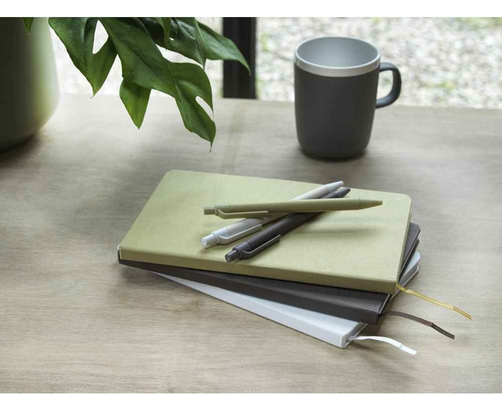 Легкая шариковая ручка для повседневных заметок. Корпус изготовлен из переработанной бумаги, полученной из ответственных источников. Коричневая бумага содержит остатки кофе, зеленая — оливок, а белая — кукурузы. Дно, зажим и наконечник изготовлены из PLA-пластика (полилактида). Черные чернила. Длина непрерывной линии: 700 метров.