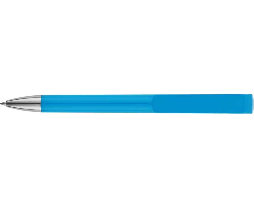Пластиковая ручка с цветным корпусом и серебристым носиком привлечет внимание своим необычным дизайном: при нажатии на кнопку двигается только часть клипа, а вторая – остается на месте. Из шести расцветок можно выбрать ту, что наилучшим образом подойдет к вашим фирменным цветам.