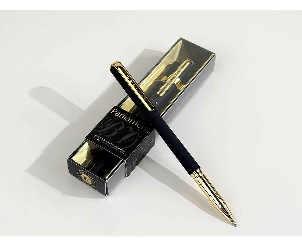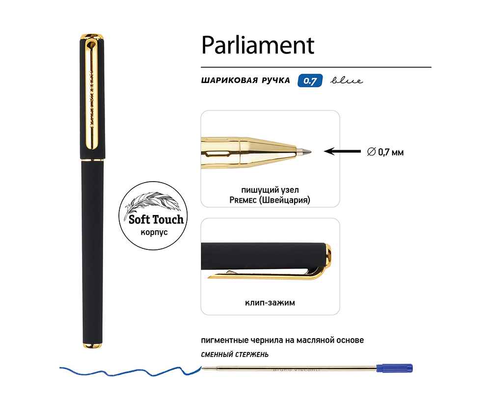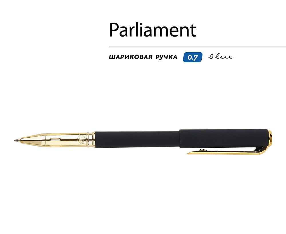 Ручка Parliament с чернилами на масляной основе синего цвета отличается мягким письмом и толщиной линии 0,5 мм. Ее прорезиненный корпус soft-touch обеспечивает комфорт при длительном использовании, а отвинчивающийся наконечник облегчает доступ к сменному стержню. Колпачок с клип-зажимом обеспечивает удобное крепление ручки на одежде или сумке. Качество письма обеспечивается премиальным швейцарским пишущим узлом диаметром 0,7 мм от производителя Premec и немецкими чернилами марки Dokumental. Ручка упакована в индивидуальную подарочную упаковку.