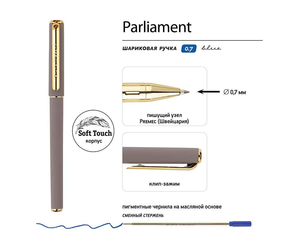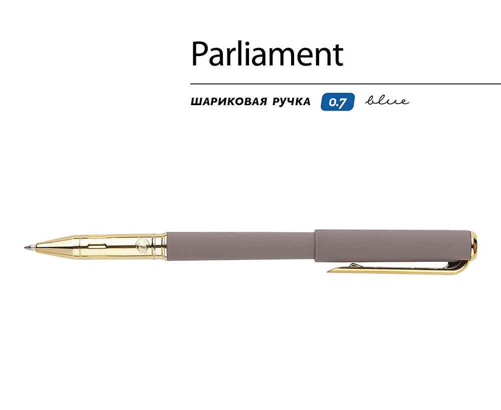 Ручка Parliament с чернилами на масляной основе синего цвета отличается мягким письмом и толщиной линии 0,5 мм. Ее прорезиненный корпус soft-touch обеспечивает комфорт при длительном использовании, а отвинчивающийся наконечник облегчает доступ к сменному стержню. Колпачок с клип-зажимом обеспечивает удобное крепление ручки на одежде или сумке. Качество письма обеспечивается премиальным швейцарским пишущим узлом диаметром 0,7 мм от производителя Premec и немецкими чернилами марки Dokumental. Ручка упакована в индивидуальную подарочную упаковку.