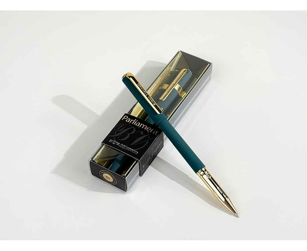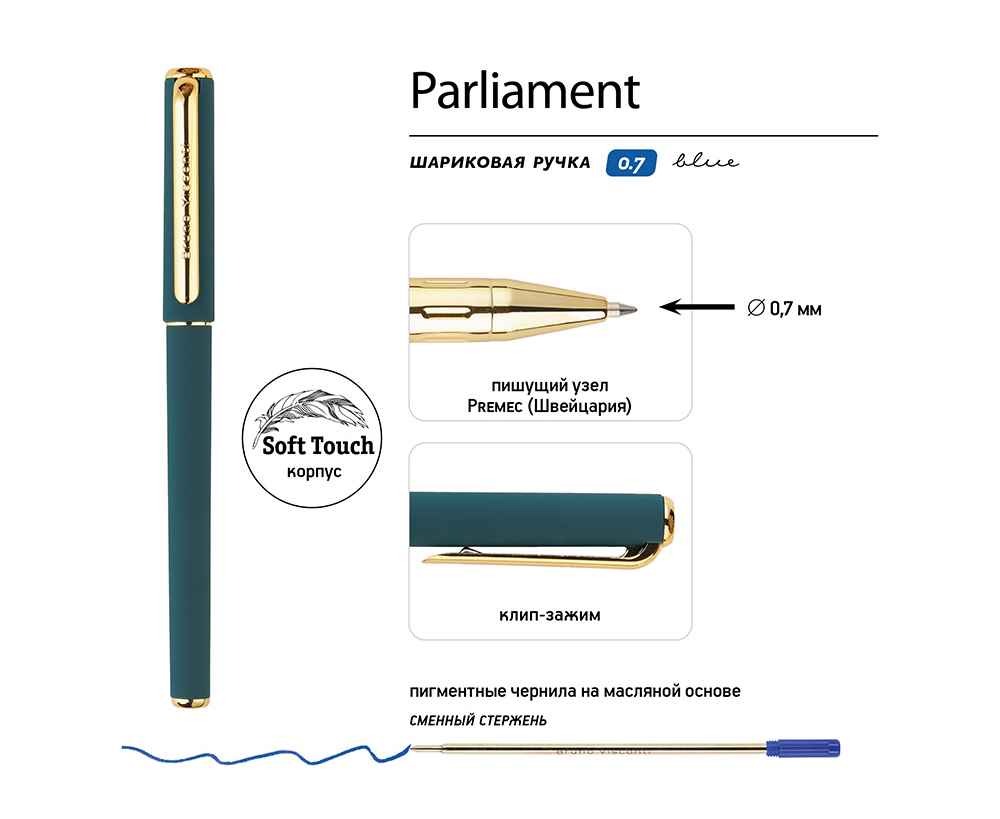 Ручка Parliament с чернилами на масляной основе синего цвета отличается мягким письмом и толщиной линии 0,5 мм. Ее прорезиненный корпус soft-touch обеспечивает комфорт при длительном использовании, а отвинчивающийся наконечник облегчает доступ к сменному стержню. Колпачок с клип-зажимом обеспечивает удобное крепление ручки на одежде или сумке. Качество письма обеспечивается премиальным швейцарским пишущим узлом диаметром 0,7 мм от производителя Premec и немецкими чернилами марки Dokumental. Ручка упакована в индивидуальную подарочную упаковку.