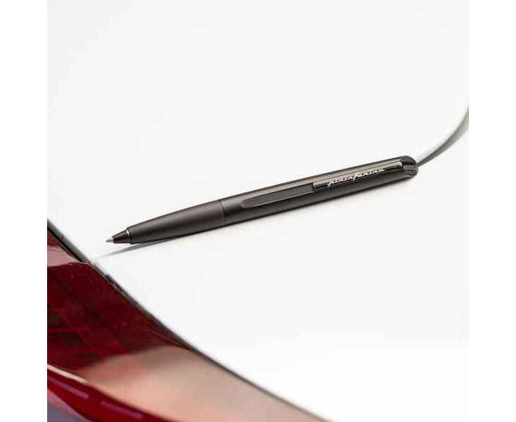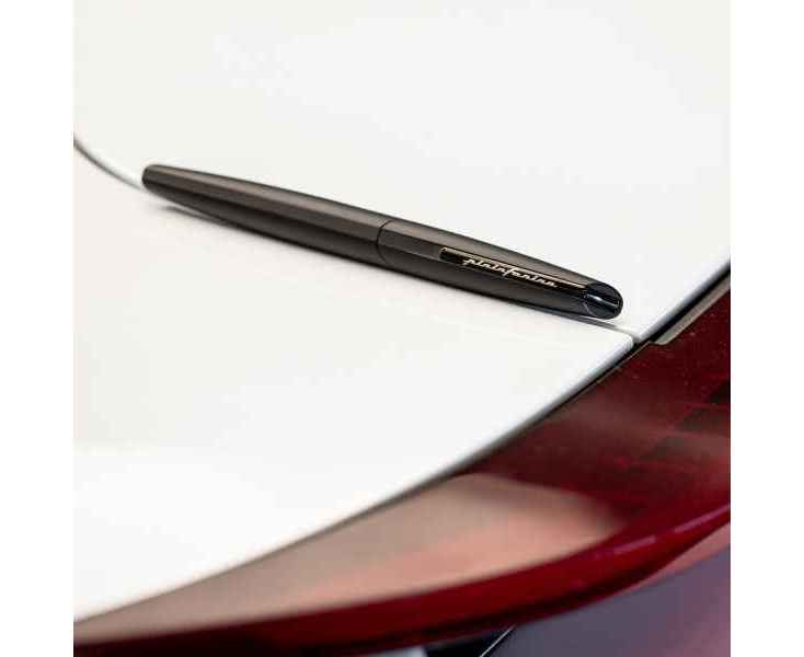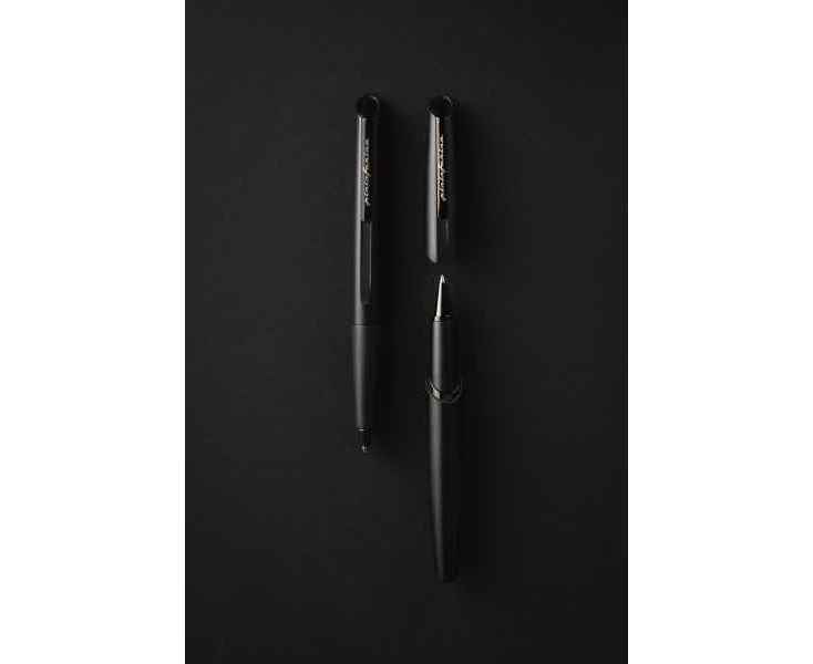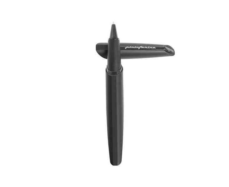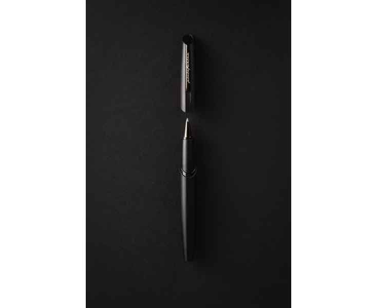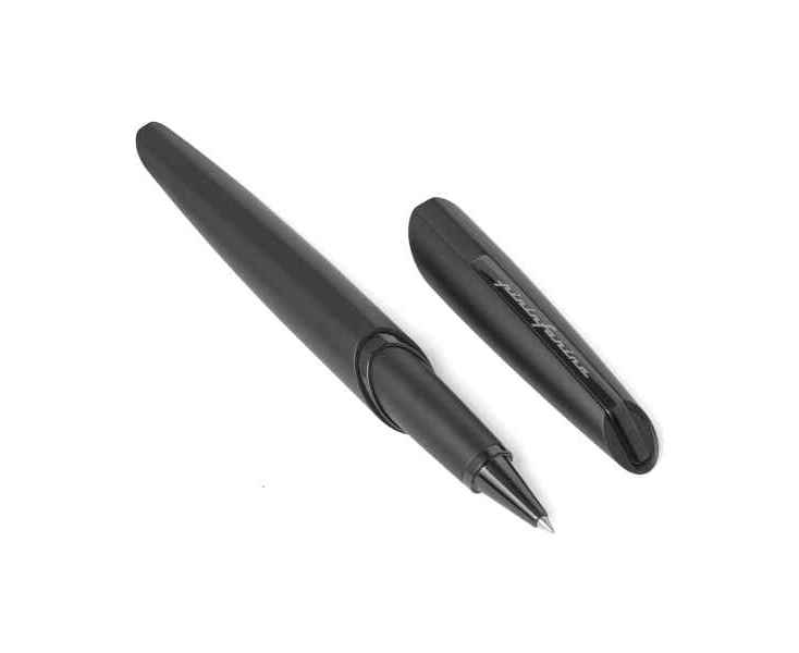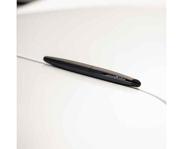 Роллер из коллекции 2021 года PF Two от дизайнеров Pininfarina. Точные геометрические формы и уникальное техническое исполнение ручки превращают ее из пишущего инструмента в совершенный аксессуар. Скошенные линии колпачка. Элегантное сочетание черного матового корпуса и глянцевого клипа на колпачке ручки. Корпус ручки выполнен из алюминия, ее длина 15 см, вес 40 гр. Упакована в серебристую округлую подарочную коробку. В ручке используется чернильный стержень Schmidt SRC 5888 с синей пастой.