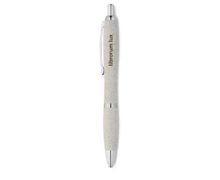Шариковая ручка, состоящая на 50% из соломы и на 50% из пластика с серебряными вставками. Синие чернила.