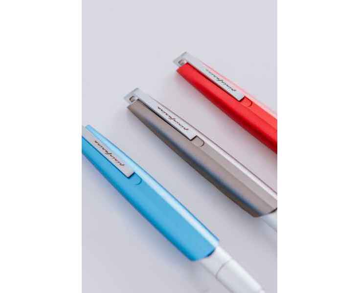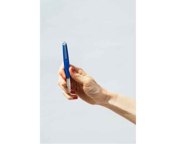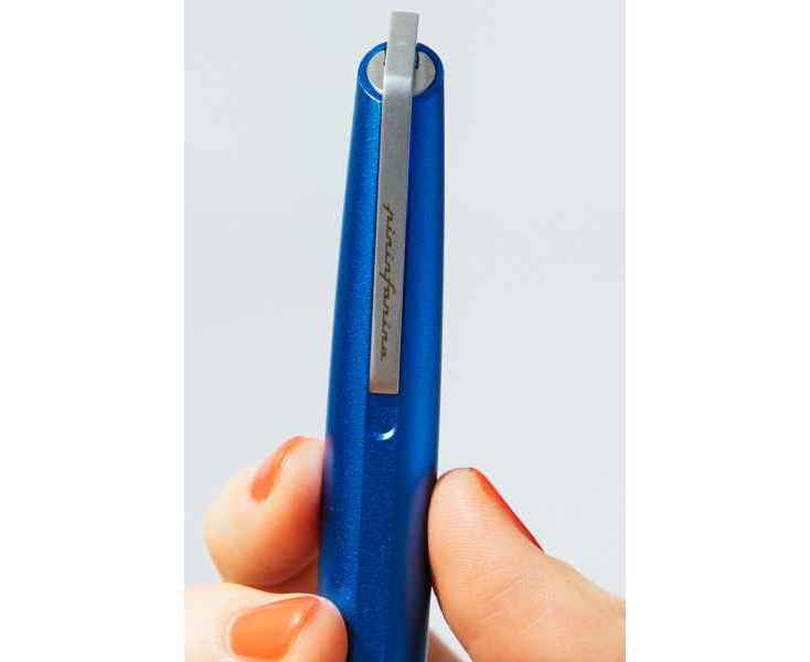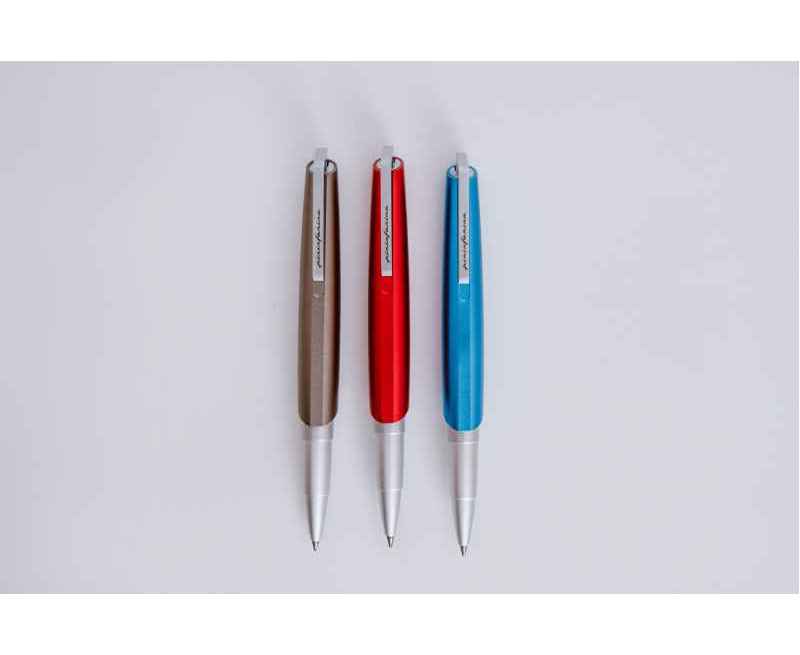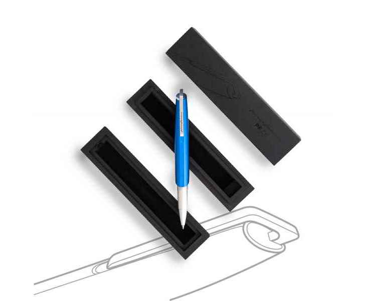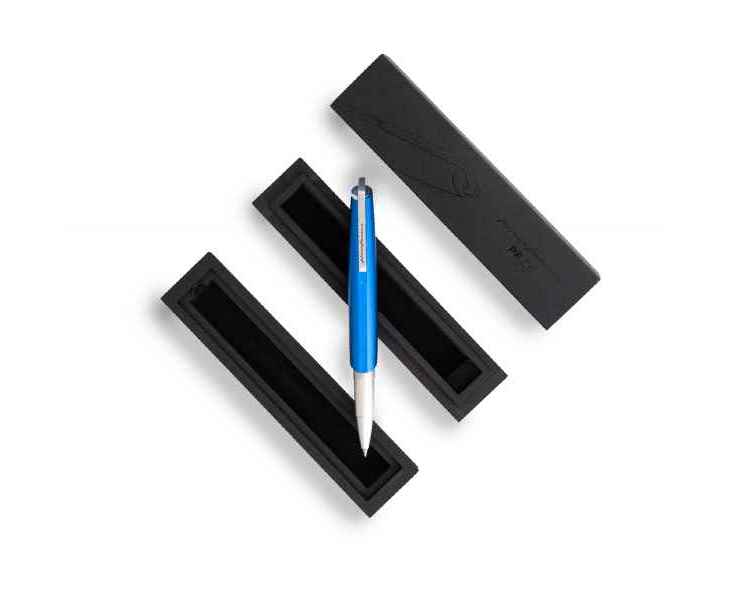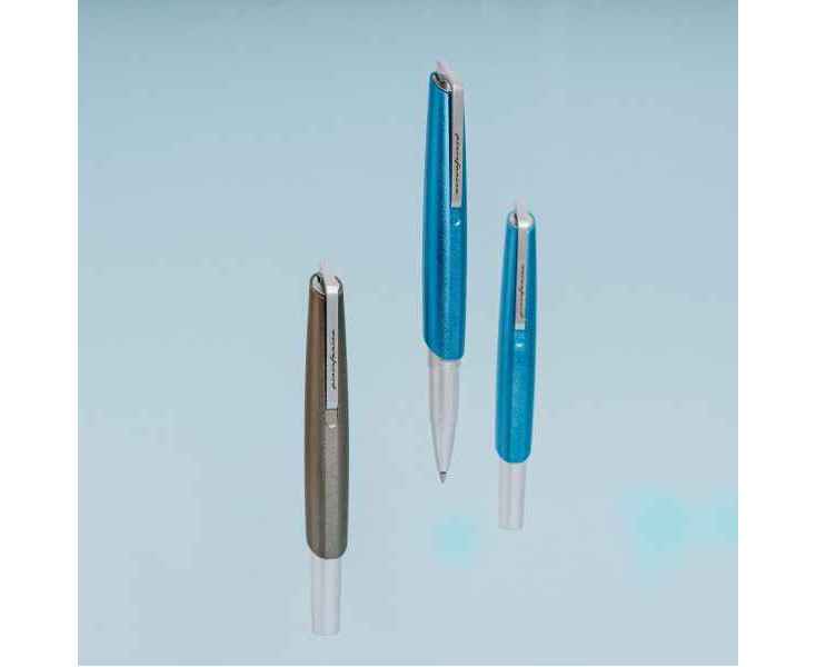 Роллер из коллекции 2023 года PF Go от дизайнеров Pininfarina. Дизайн и простота использования - вот те составляющие, которые вдохновили Pininfarina на создание коллекции GO. Сочетание ярко-синего завинчивающегося колпачка и корпуса серебристого цвета. Корпус ручки выполнен из алюминия, ее длина 12 см, диаметр 1 см, вес 29 гр. Оригинальный дизайн клипа. Упакована в черную коробку из дизайнерского многослойного картона 15х3,5х2 см. В ручке используется чернильный стержень Schmidt P8127 с синей пастой. Сделана в Италии.