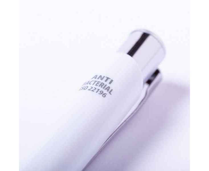 Антибактериальная шариковая ручка с кнопоным механизмом и стилусом,серого цвета. Продукты с антибактериальной обработкой способны резко снизить уровень бактерий, присутствующих на поверхностях материалов, благодаря добавлению постоянных статических микробных агентов, с высокой эффективностью ингибирующих и предотвращающих бактериальное загрязнение. Изделие соответствует стандарту ISO 22196, который определяет антибактериальную активность в пластичных материалах и непористых поверхностях. Стержень Jumbo refill c синими чернилами.