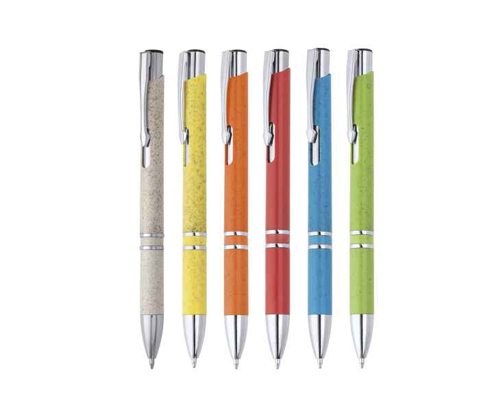 Кнопочная ручка из пшеничного волокна и АБС с серебряными деталями. Джамбо-заправка синими чернилами. Пшеничное волокно и ABS.