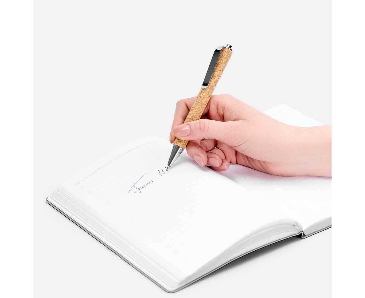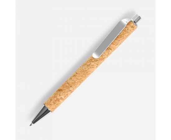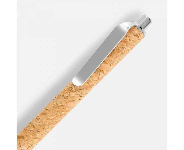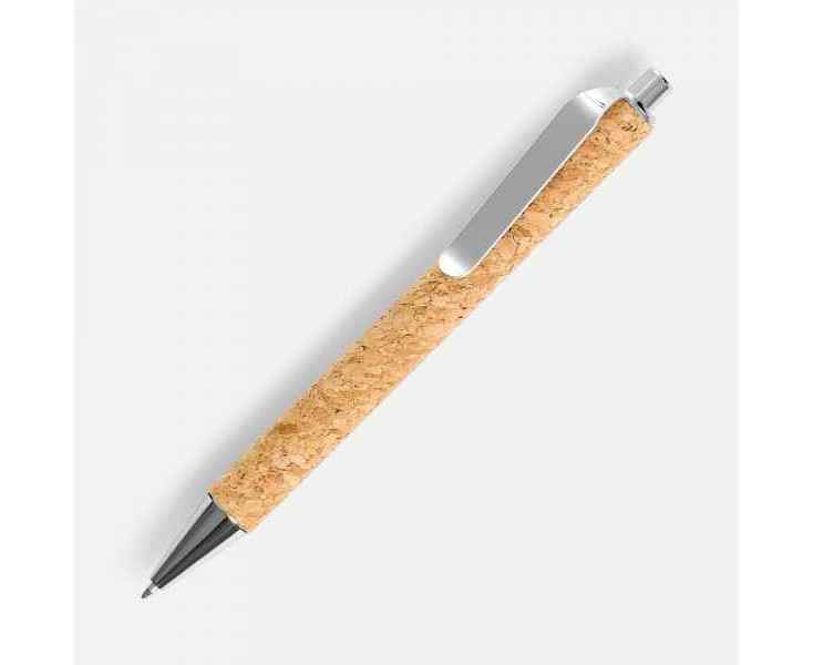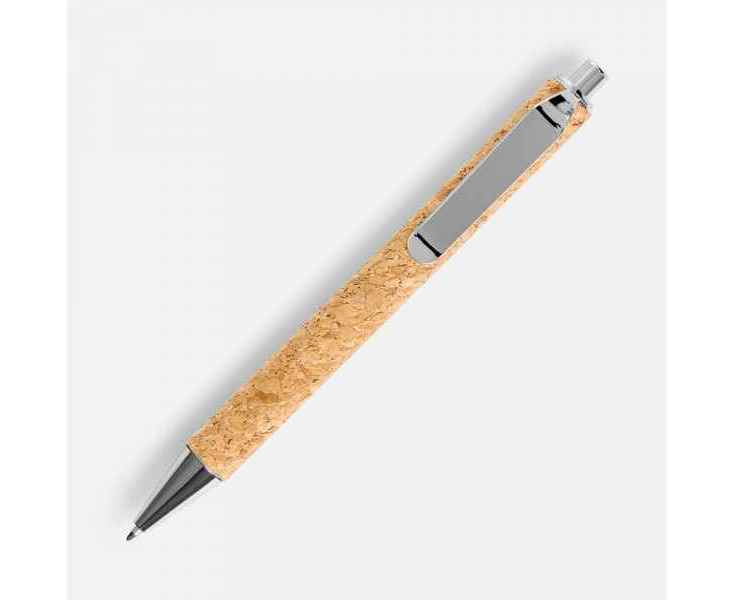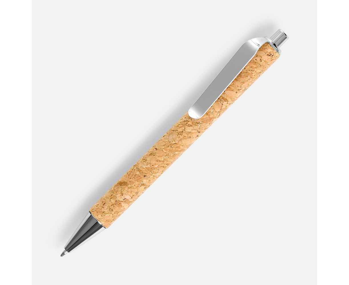 Шариковая ручка с корпусом из пробки крупной текстуры и широким металлическим клипом для нанесения логотипа.