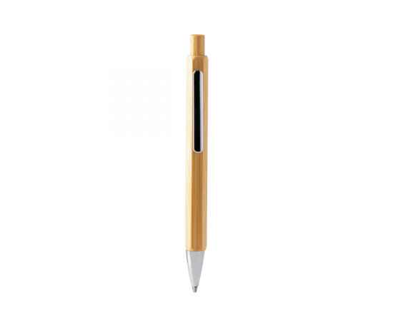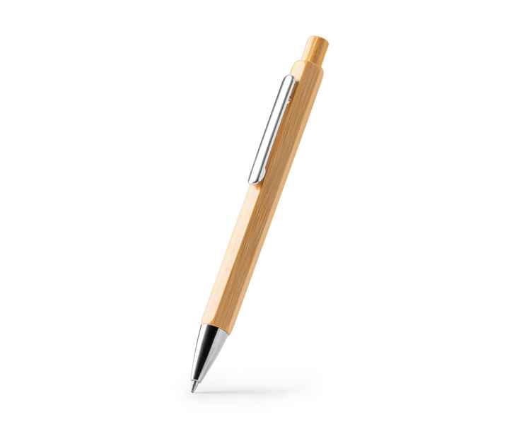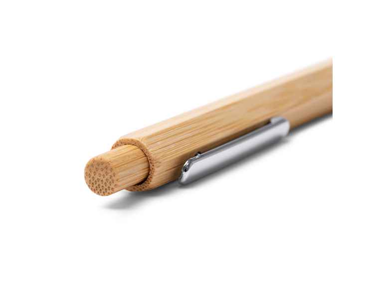 Шестигранная ручка с металлическим корпусом и бамбуковой кнопкой. Хромированные детали. Синие чернила.