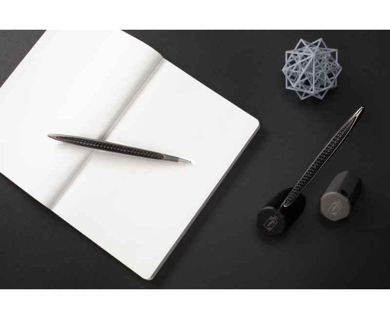 Культовая ручка Pininfarina Cambiano приобретает новый облик благодаря наклонной подставке, напоминающей скульптуру. Ее динамичная форма, кажется, бросает вызов силе тяжести, создавая эффектное сценическое положение благодаря игре с равновесием. Черный блестящий корпус ручки также выглядит по-новому: на вставках нанесена 3D-печать из расплавленного нейлонового порошка, создающая трехмерный гибкий объект. Перфорированная текстура напоминает архитектурный контекст и является “фишкой” всей коллекции Transition.Корпус ручки выполнен из алюминия. Вес ручки 39 гр, длина 16 см, диаметр 1 см. В ручке используется шариковый стержень CROSS® 8513 M с синей пастой. Подставка черная матовая из анодированного алюминия. Набор упакован в большую подарочную коробку.