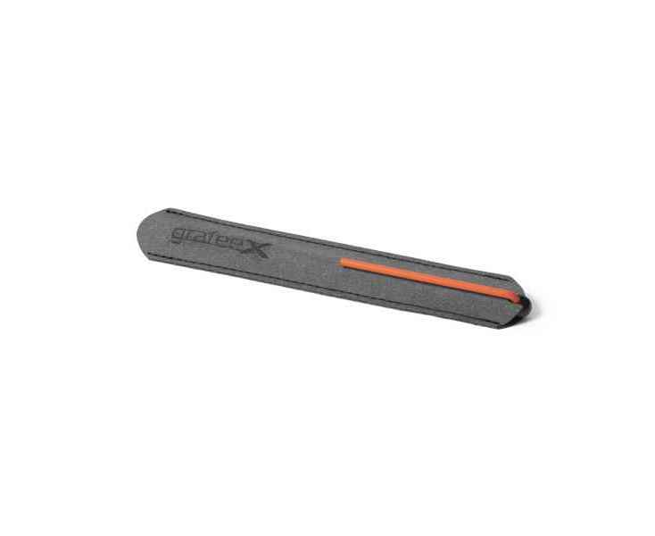 Шариковая ручка с цельным алюминиевым матовым корпусом черного цвета и ярко-оранжевым клипом. Дизайн ручки такой же, как и у инновационного карандаша GrafeeX. В ручке используется шариковый стержень CROSS® 8513 с синей пастой, который выдвигается с помощью поворотного механизма Ручка вкладывается в элегантный темно-серый чехол с серой прострочкой, сшитый вручную из рециклированной кожи.
