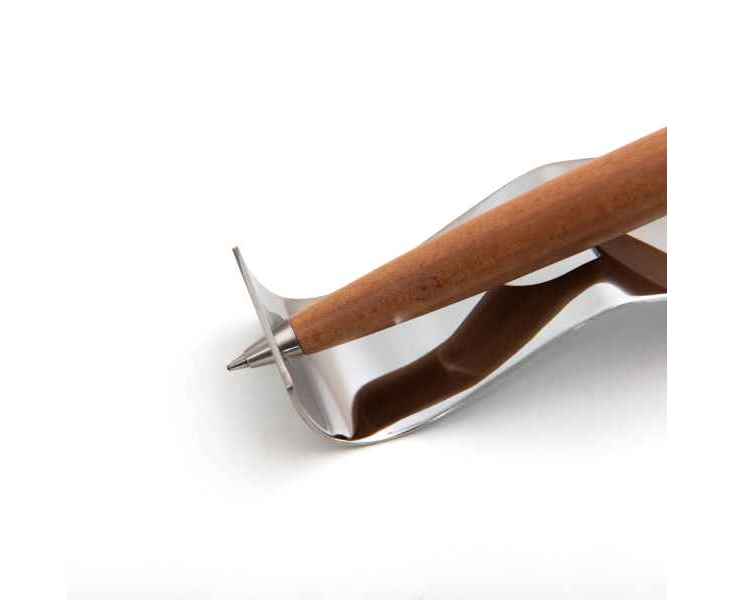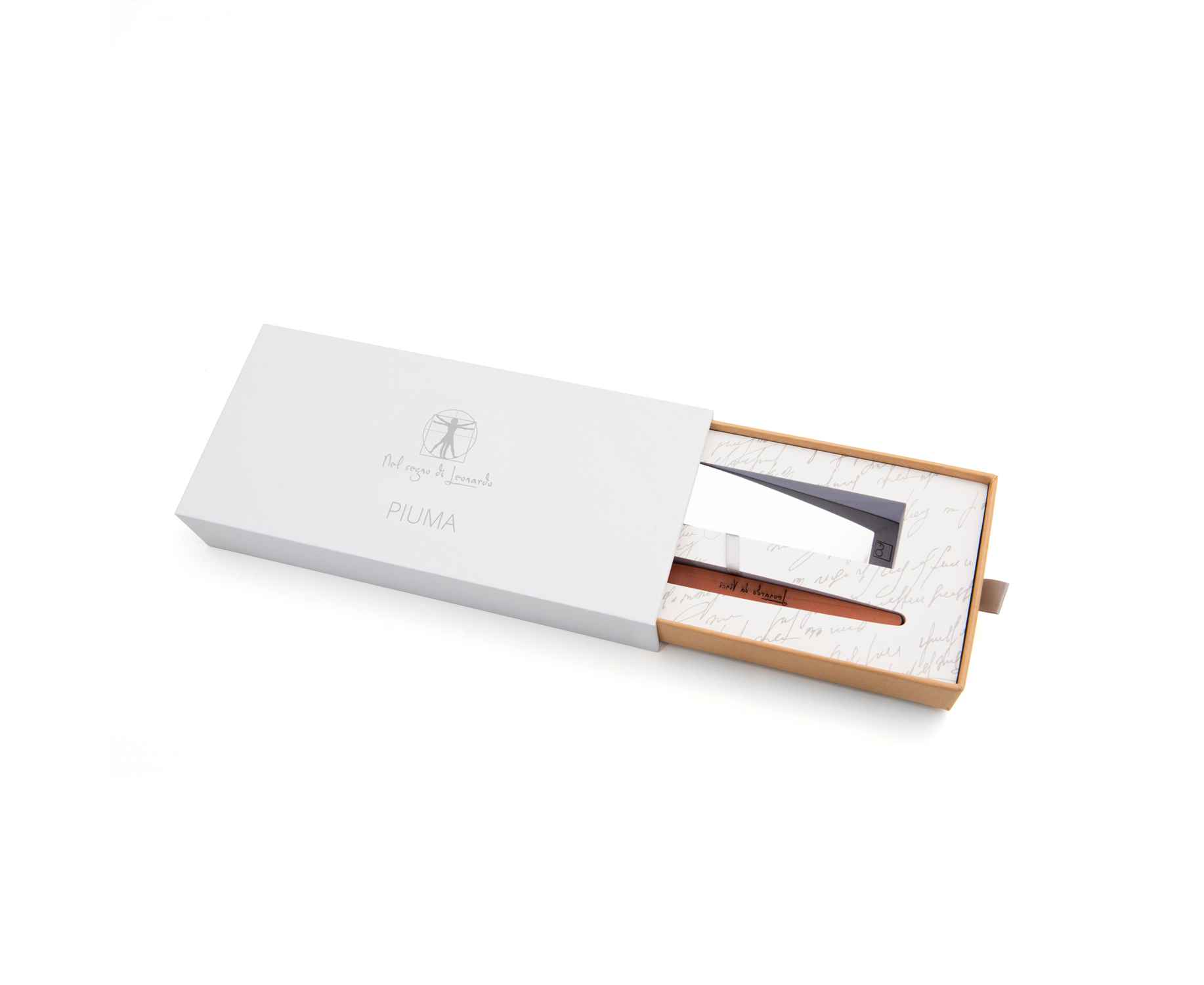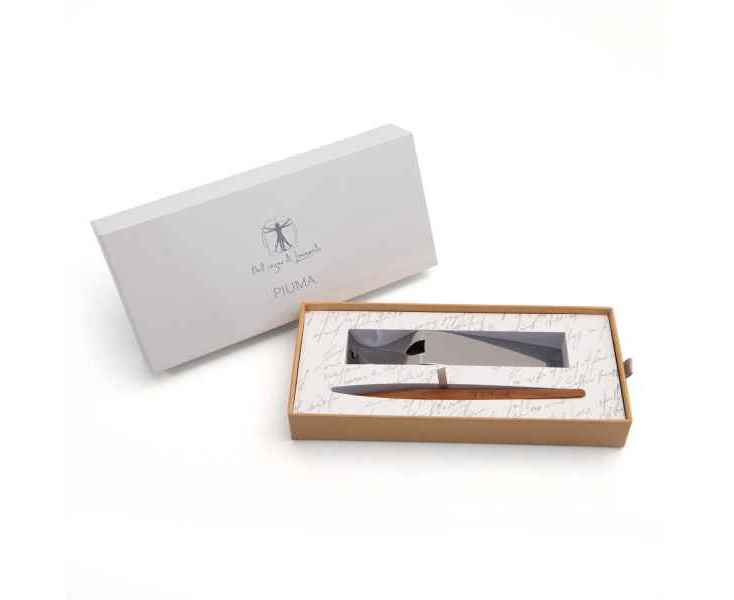 Pininfarina PIUMA - шариковая ручка динамической формы в виде гусиного пера сделана в память Кодекса о полете птиц Леонардо да Винчи, целью которого было понять тайну полета и который хранится сейчас в Королевской библиотеке Турина. Ручка полностью сделана из дерева груши. На ее корпусе выгравирован зеркальный автограф Мастера, который отражается в отполированной стальной настольной подставке для ручки. В ручке используется шариковый стержень Schmidt ® S635 (D1) с синей пастой. Набор упакован в белую подарочную коробку.