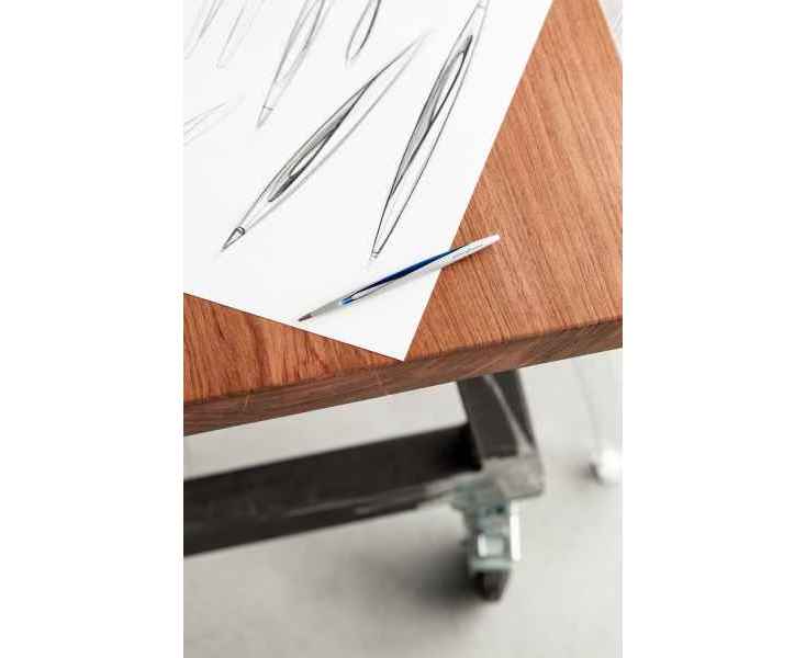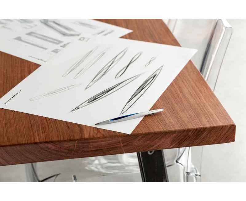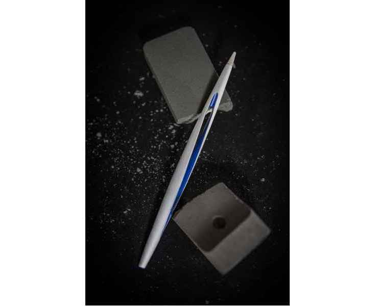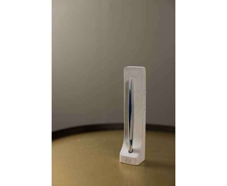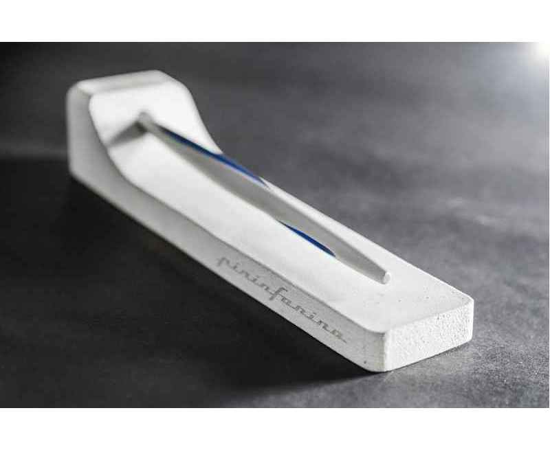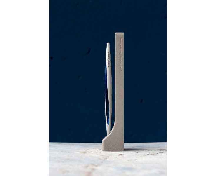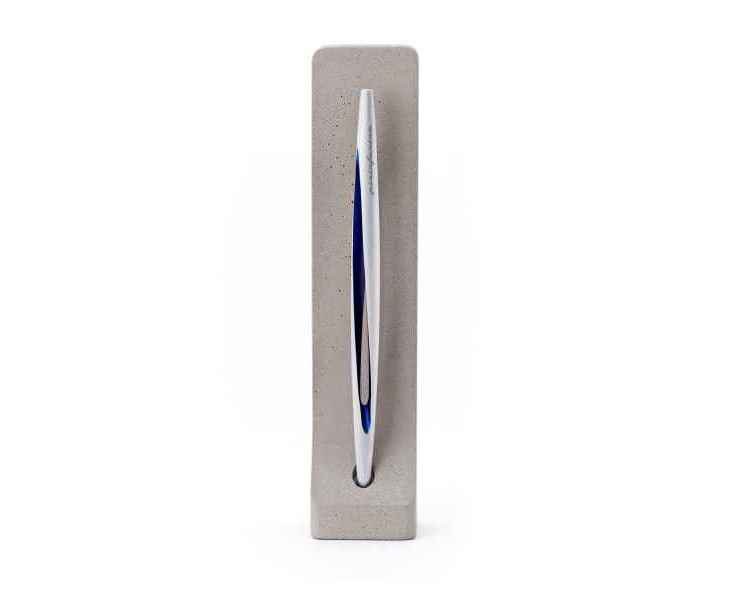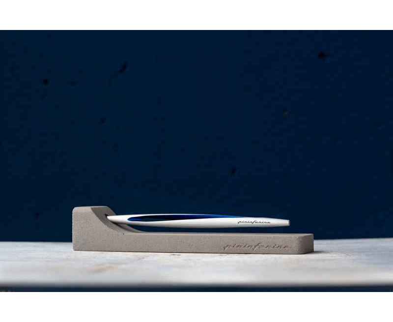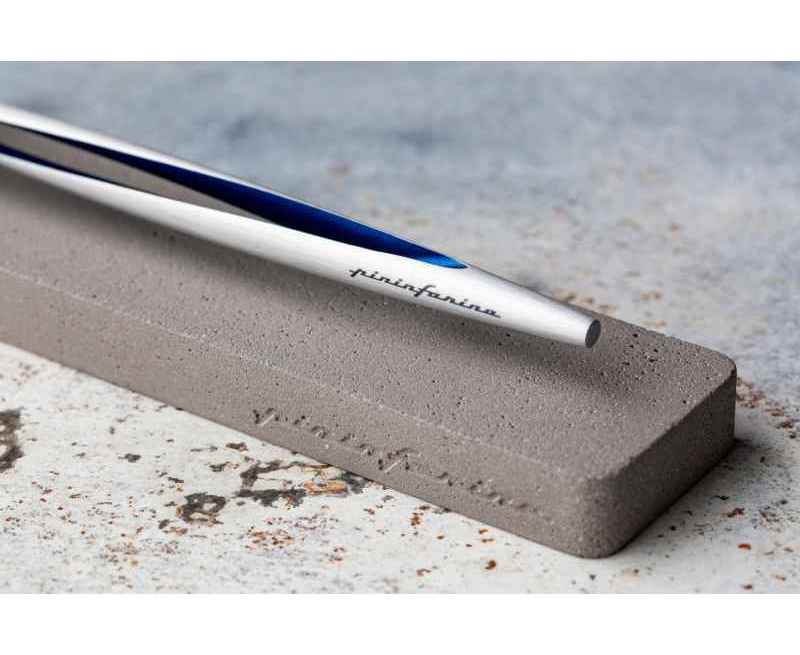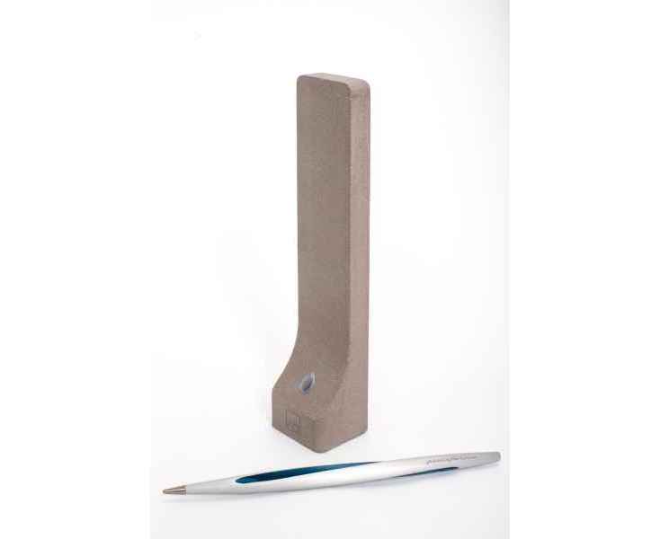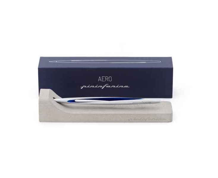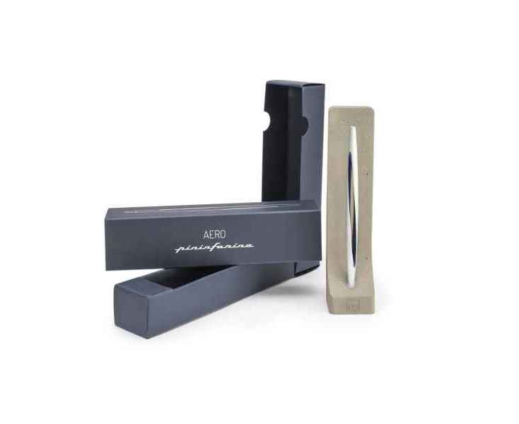 Вдохновленные мощью, формой и красотой воздушных потоков, дизайнеры концерна Pininfarina создали новую модель вечной ручки Pininfarina Aero. Ее элегантная форма напоминает знак бесконечности, корпус ручки очень легкий - всего 17 гр при длине ручки 16 мм - выполнен из аэрокосмического алюминия и оснащен наконечником Ethergraf, который изготовлен из сплава металлов по запатентованной технологии. Наконечник не содержит свинец и алюминий, производится вручную итальянскими мастерами и практически не расходуется за десятилетия использования. При соприкосновении с поверхностью бумаги, происходит химическая реакция и наконечник оставляет серебристый след, который напоминает цвет графитового карандаша, но обладает большей стойкостью. Идеально пишет на каменной бумаге. Внутри 'воздушной петли' на корпусе ручки имеются контрастные элементы синего цвета. Легкая, прочная, изысканная ручка контрастирует с тяжелой бетонной подставкой, давая понять, что даже несовместимые на первый взгляд вещи могут существовать в полной гармонии друг с другом. Эта бетонная подставка будет необычным аксессуаром на письменном столе, служа вертикальной настольной подставкой для ручки. Обладатель премии Red Dot Design Award.