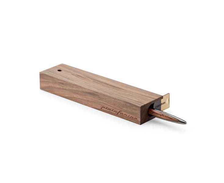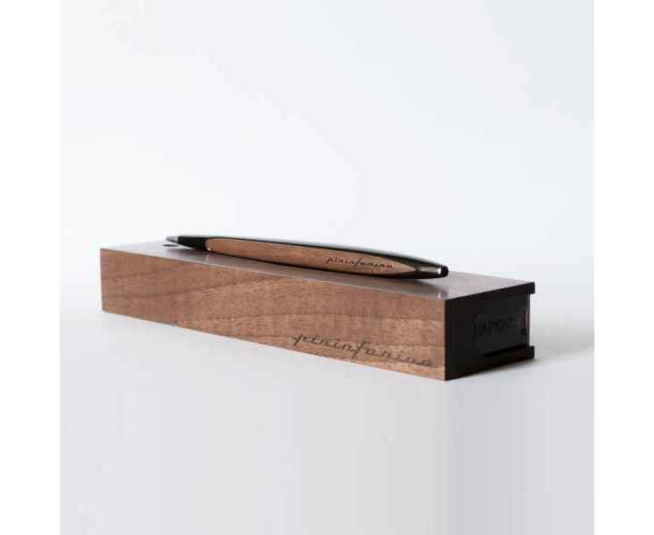 Флагманская ручка дизайнерского дома Pininfarina сочетает в себе роскошь и смелые дизайнерские решения. Pininfarina Cambiano - это объединение различных материалов, технологичность и элегантные линии. Вечная ручка имеет необычный пишущий узел в виде наконечника Ethergraf, который изготовлен из сплава металлов по запатентованной технологии. Он не содержит свинец и алюминий, производится вручную итальянскими мастерами и практически не расходуется за десятилетия использования. При соприкосновении с поверхностью бумаги, происходит химическая реакция и наконечник оставляет серебристый след, который напоминает цвет графитового карандаша, но обладает большей стойкостью. Идеально пишет на каменной бумаге. Корпус ручки выполнен из алюминия с черным глянцевым покрытием и вставками из дерева грецкого ореха. Вес ручки 39 гр, длина 16 см. Коробка выполнена из дерева грецкого ореха и одновременно является настольной подставкой для ручки.